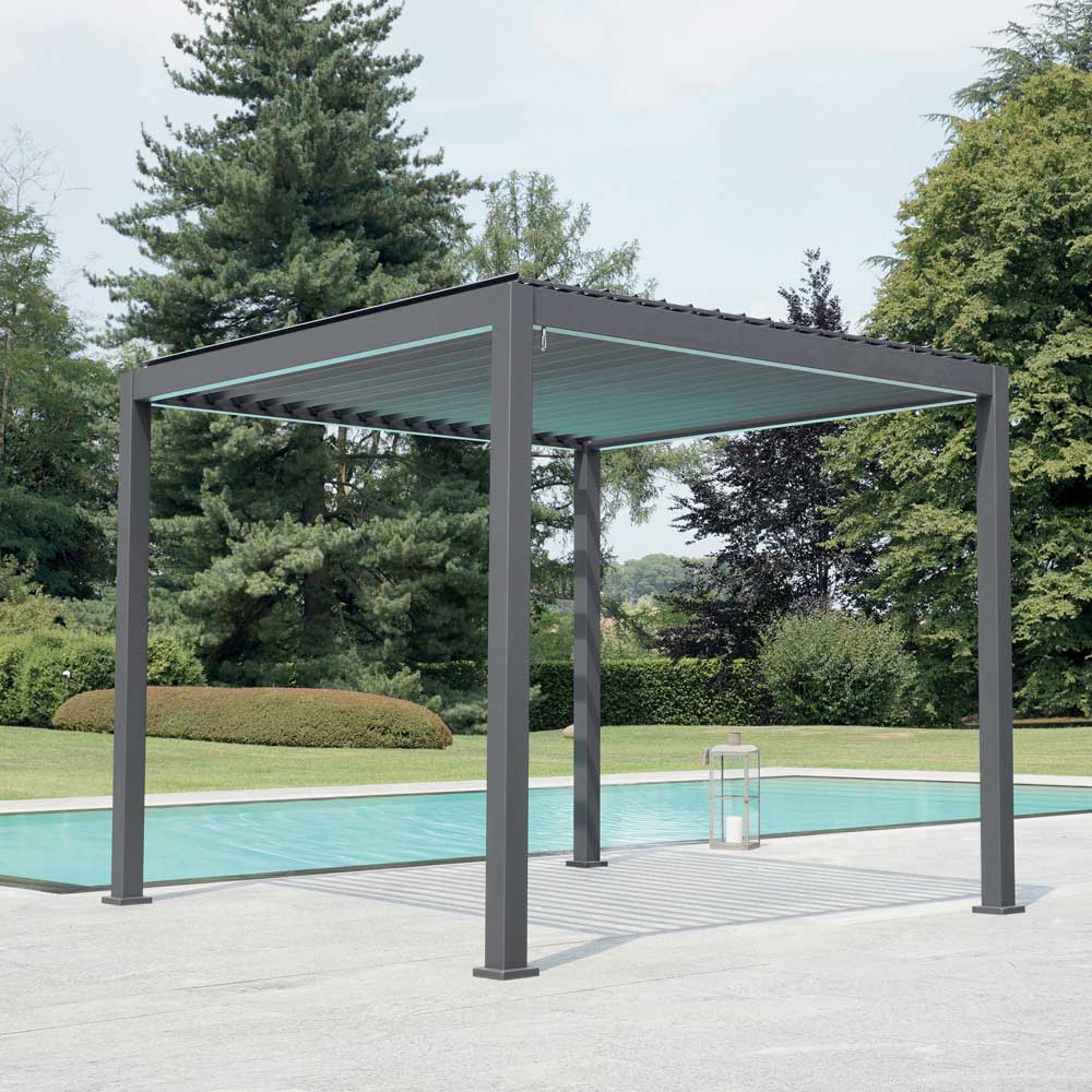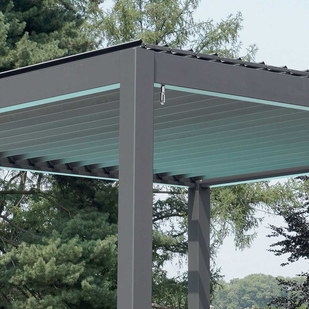 El techo de lamas ajustable permite ajustar la cantidad de luz y sombra con extrema facilidad, creando un ambiente confortable a cualquier hora del día. El color neutro y sofisticado realza las líneas limpias, ofreciendo una sensación de orden y refinamiento .