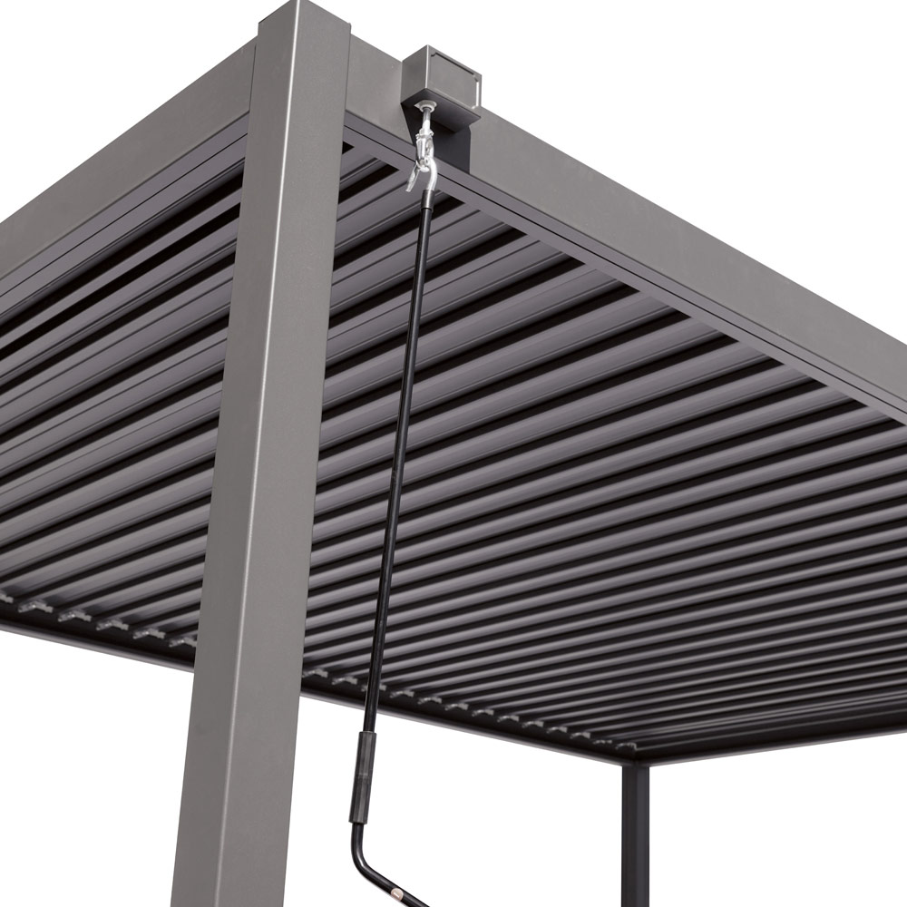 Los postes de soporte de aluminio de 90 x 90 mm y los travesaños de techo de 120 x 30 mm / 147 x 30 mm proporcionan una estructura sólida y fiable. El techo de lamas ajustable , accionado mediante una manivela externa de acero , permite ajustar fácilmente la entrada de luz y la ventilación, creando el ambiente ideal a cualquier hora del día.