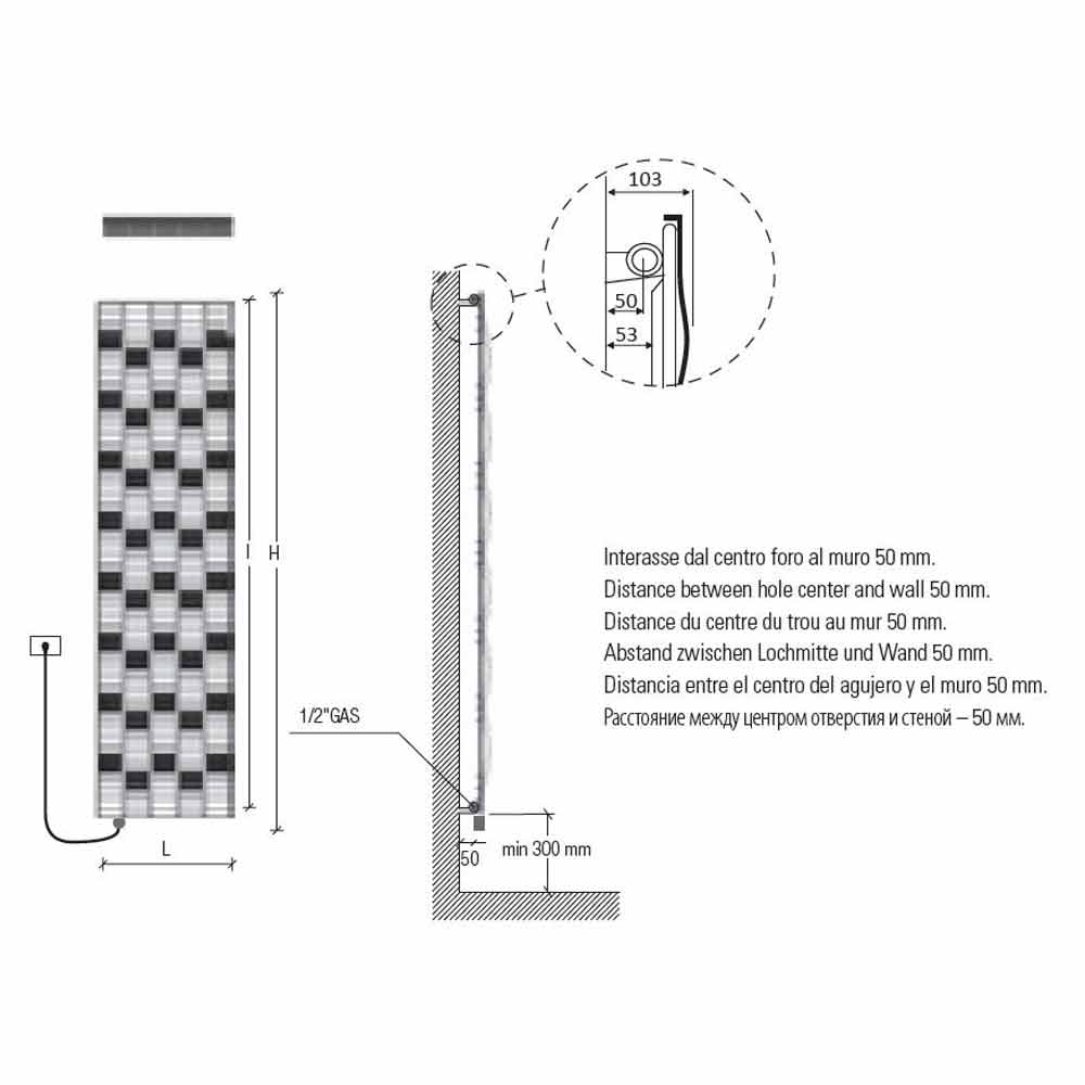 A la altura hay que añadir el termostato de 110 mm. Caja termostática blanca de serie para radiadores blancos; cromado para los radiadores de colores y acabados en acero inoxidable. Fuente de alimentación monofásica de 230 voltios.