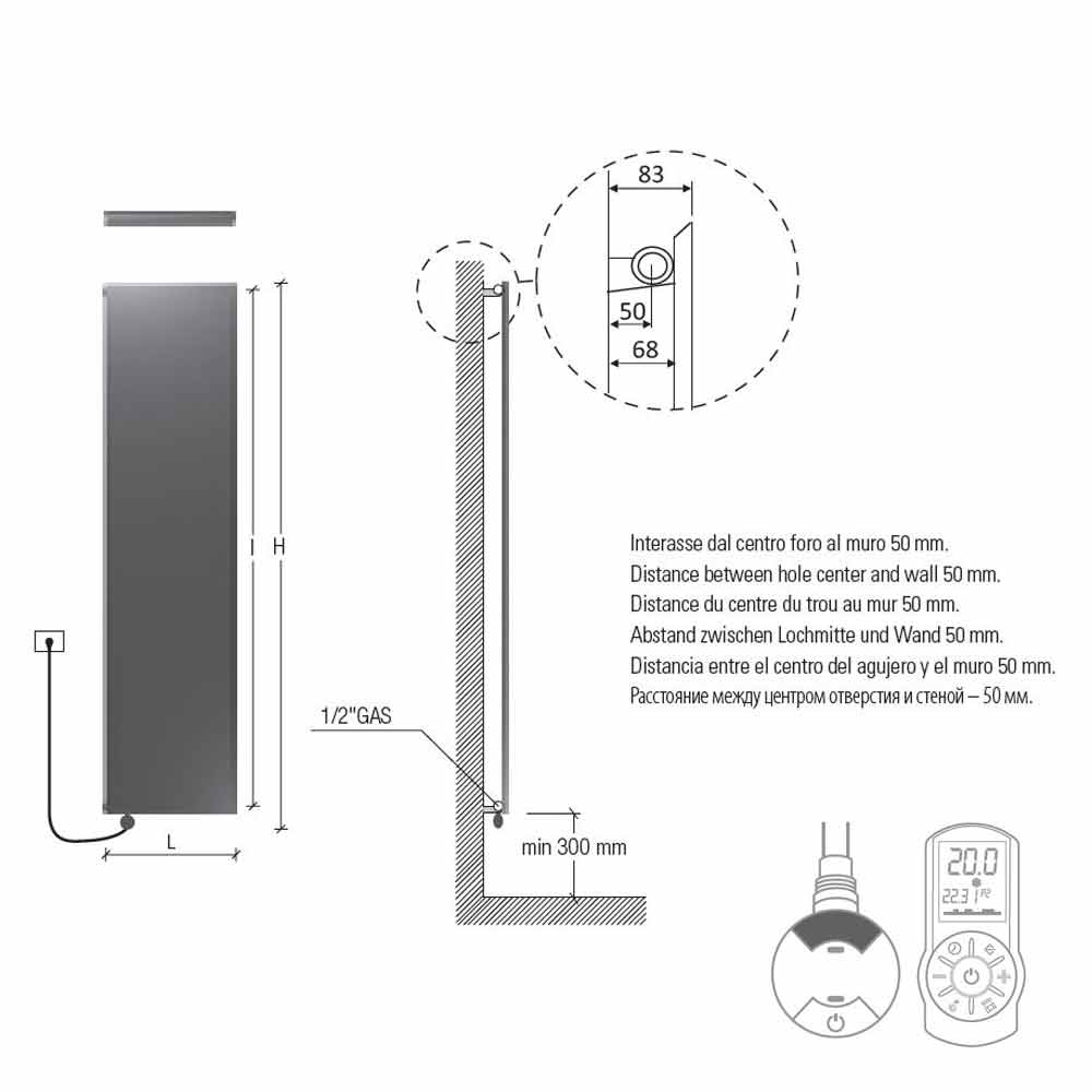 A la altura hay que añadir el termostato de 110 mm. Caja termostática blanca de serie para radiadores blancos; cromado para los radiadores de colores y acabados en acero inoxidable. Fuente de alimentación monofásica de 230 voltios.