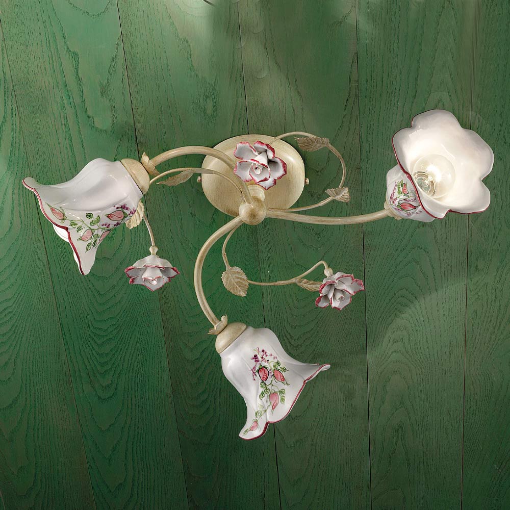 Plafón de 3 luces en metal y cerámica con rosas pintadas a mano fabricada en Italia por Ferroluce.