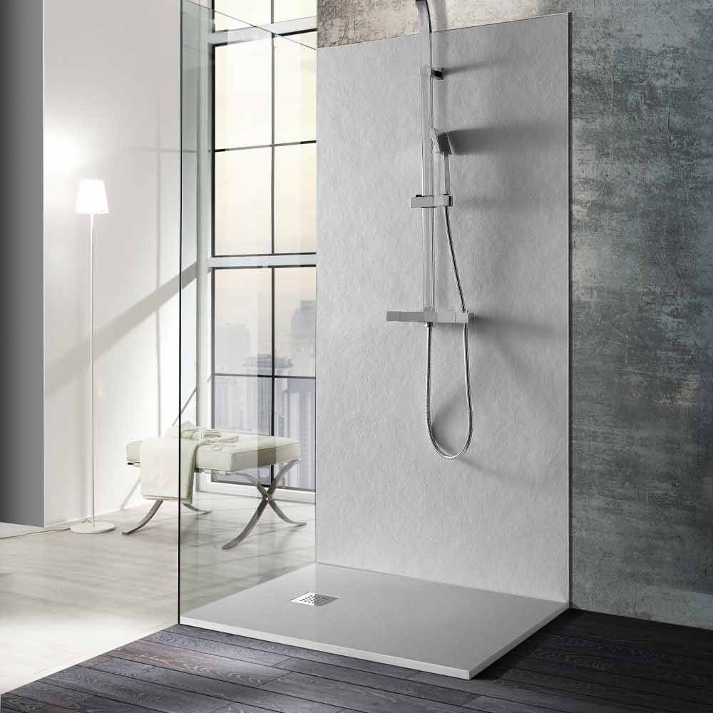 Plato de ducha moderno en resina con acabado efecto piedra con rejilla de acero.