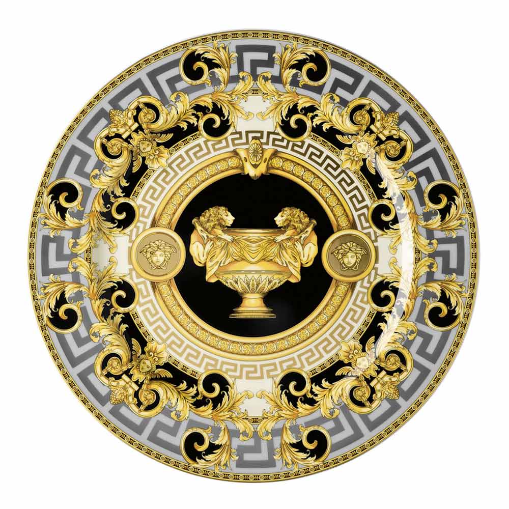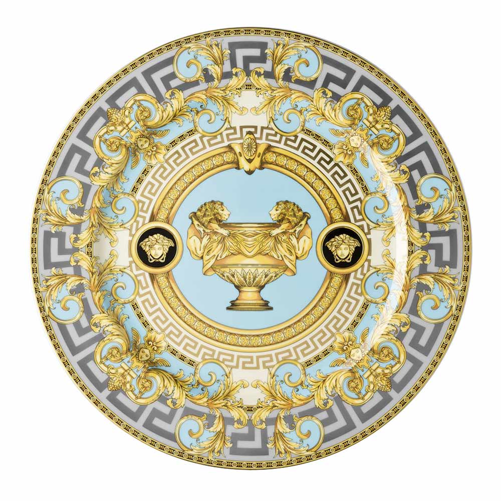 El plato para mesa Prestige Gala de Versace , fabricado en porcelana refinada , es un auténtico homenaje a la elegancia clásica y al lujo atemporal. El extraordinario diseño está dominado por una espléndida ánfora dorada , símbolo de la realeza y la majestuosidad, en el centro de un marco adornado con el clásico motivo griego y detalles florales barrocos en oro. Disponible en dos variaciones de fondo, negro y azul claro, este plato ofrece un sofisticado contraste que realza cada mise en place.