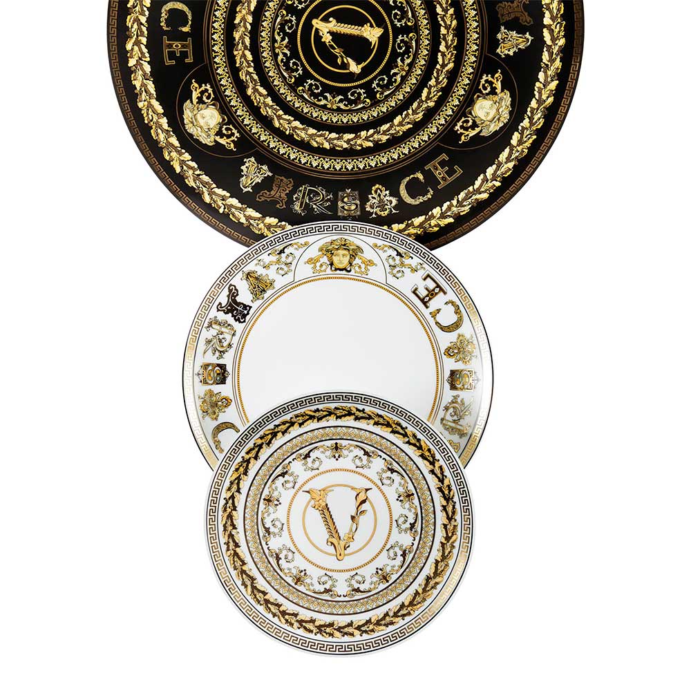 El mantel individual Virtus Gala de Versace es una auténtica celebración del lujo y el refinamiento , elaborado a partir de porcelana preciosa . Su diseño distintivo combina un color brillante con decoraciones doradas visualmente impactantes, enriquecidas con detalles barrocos y el icónico logotipo "V" de Versace, un símbolo de elegancia atemporal.