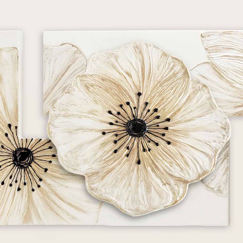 Composición floral sobre tela, deocorada a mano, detalles de resina sobre matérico, estructura doble con elemente centrale en relieve y retoque lúcido.