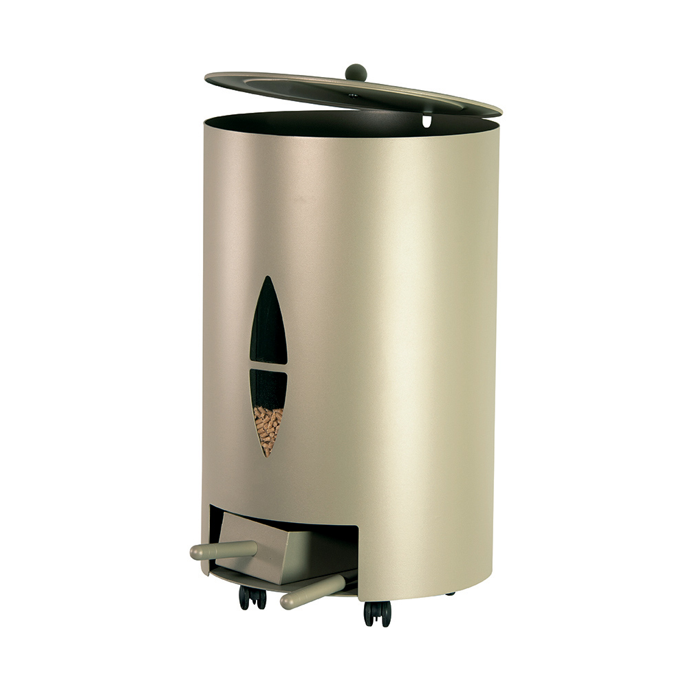 Este porta pellets para chimenea destaca por su diseño cilíndrico y moderno , se adapta fácilmente a cualquier ambiente del hogar. La sólida estructura de metal garantiza resistencia y longevidad, mientras que las ruedas integradas garantizan un fácil movimiento. El contenedor está equipado con una tapa superior , que protege el pellet de la humedad y el polvo, manteniéndolo seco y listo para su uso. Además, la ventana frontal no sólo aporta un toque estético sino que permite controlar el nivel de pellet sin tener que abrir el contenedor. Este porta pellets es la solución ideal para quienes buscan practicidad, limpieza y estilo en la calefacción de su hogar.