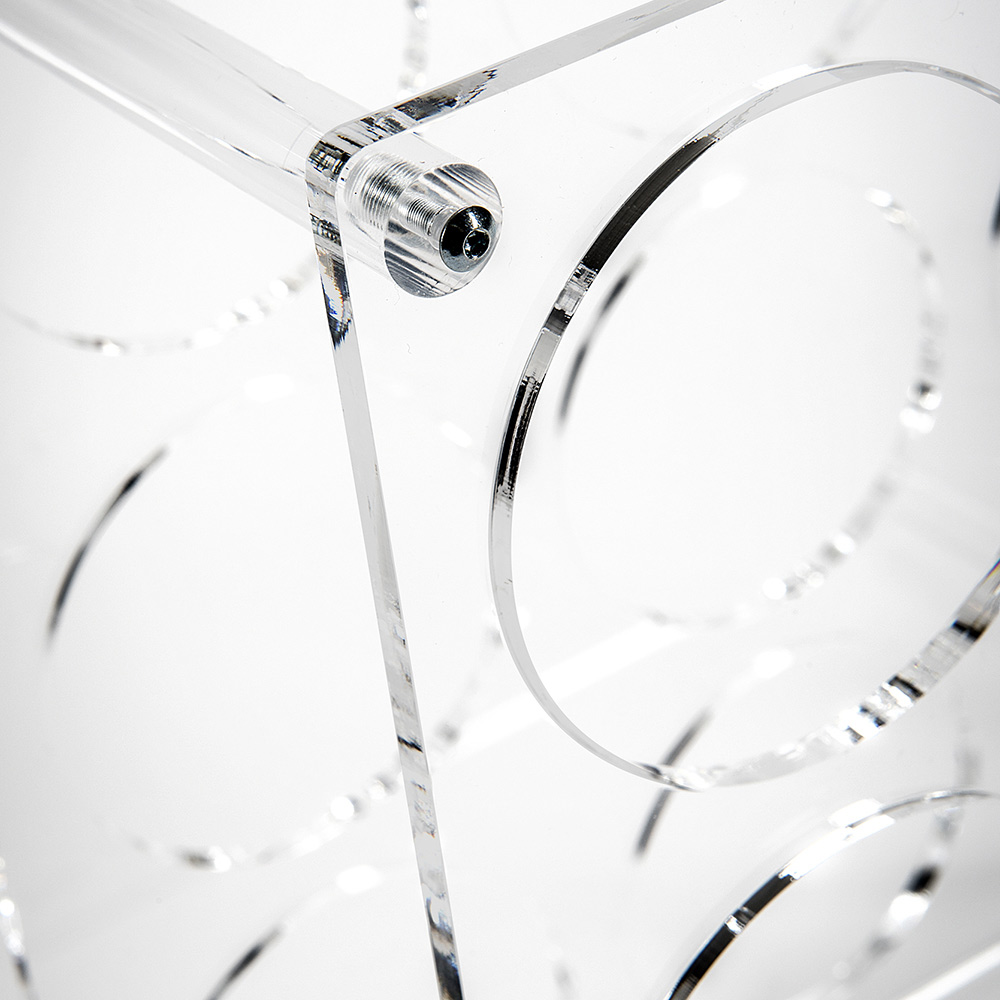 Botellero de pie íntegramente fabricado en Italia en PMMA plexiglás 100% de polímero virgen y hoja de esencia de madera, permite almacenar hasta 12 botellas de vino y champán. Práctico para mantener en orden los vinos y las bebidas, sirve perfectamente como mueble de diseño gracias a su estética funcional y su forma original que recuerda la forma de un barril de vino.
