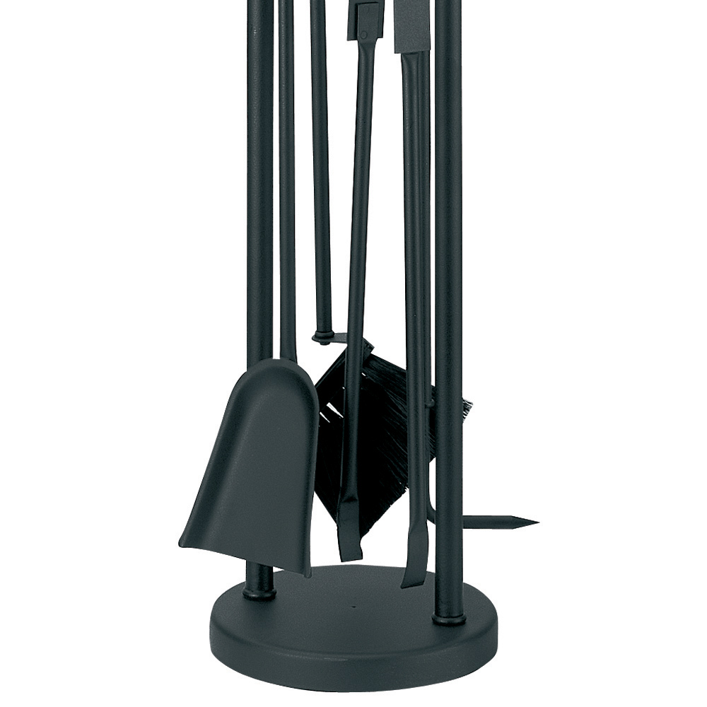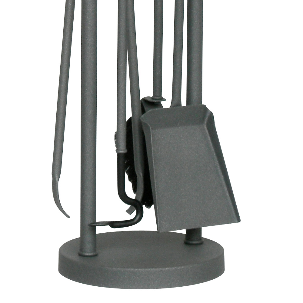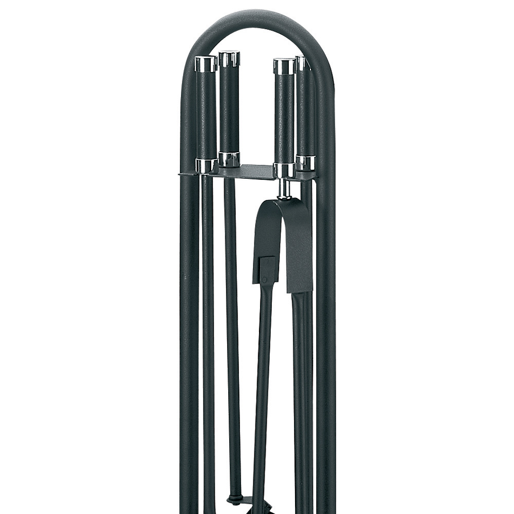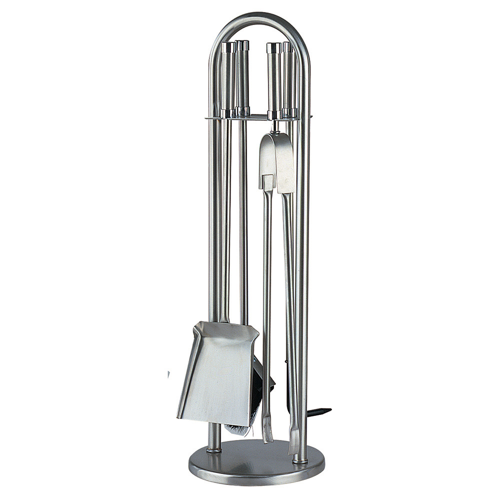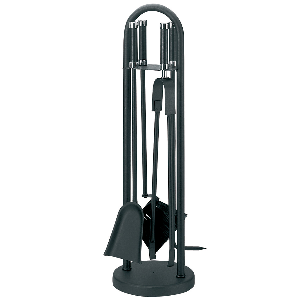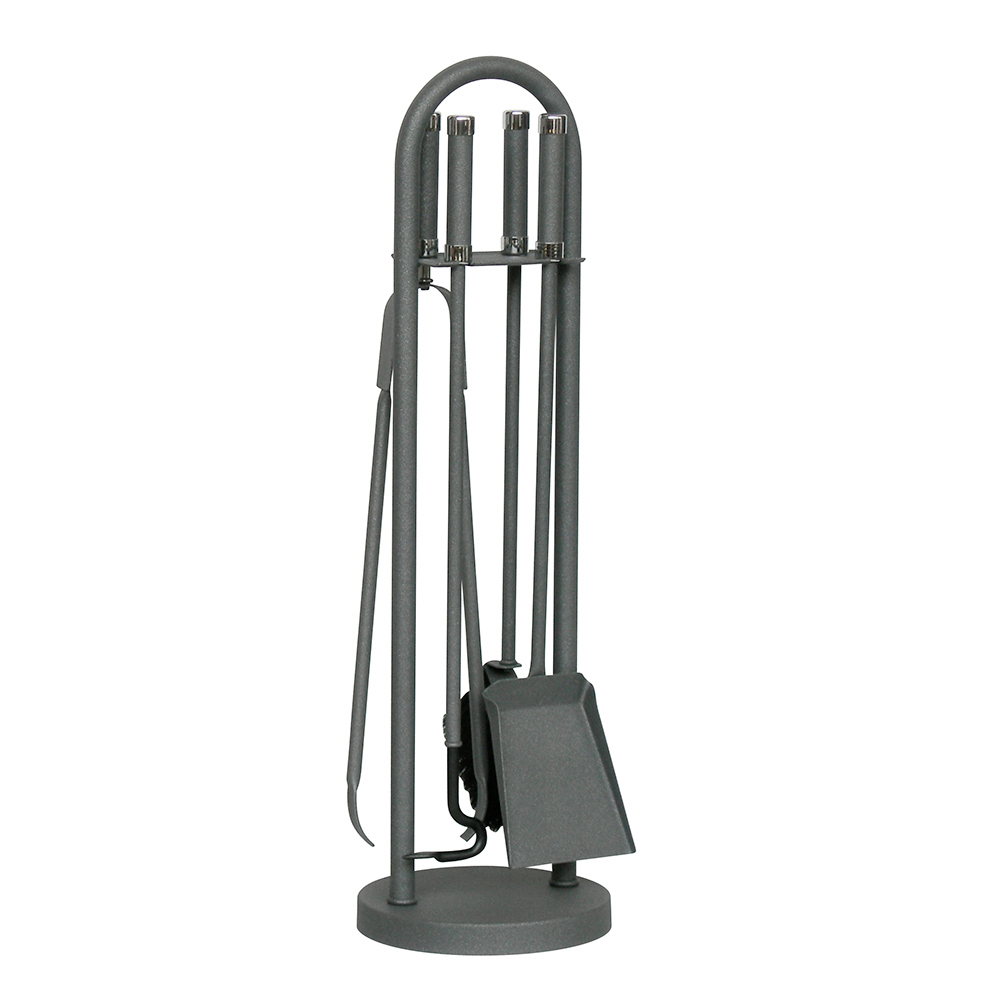 El juego incluye cuatro herramientas esenciales para el cuidado de su chimenea , cada una con mangos largos para un manejo seguro del fuego. Las herramientas están elegantemente suspendidas sobre soportes, lo que hace que el juego no sólo sea práctico sino también una parte integral de su decoración.