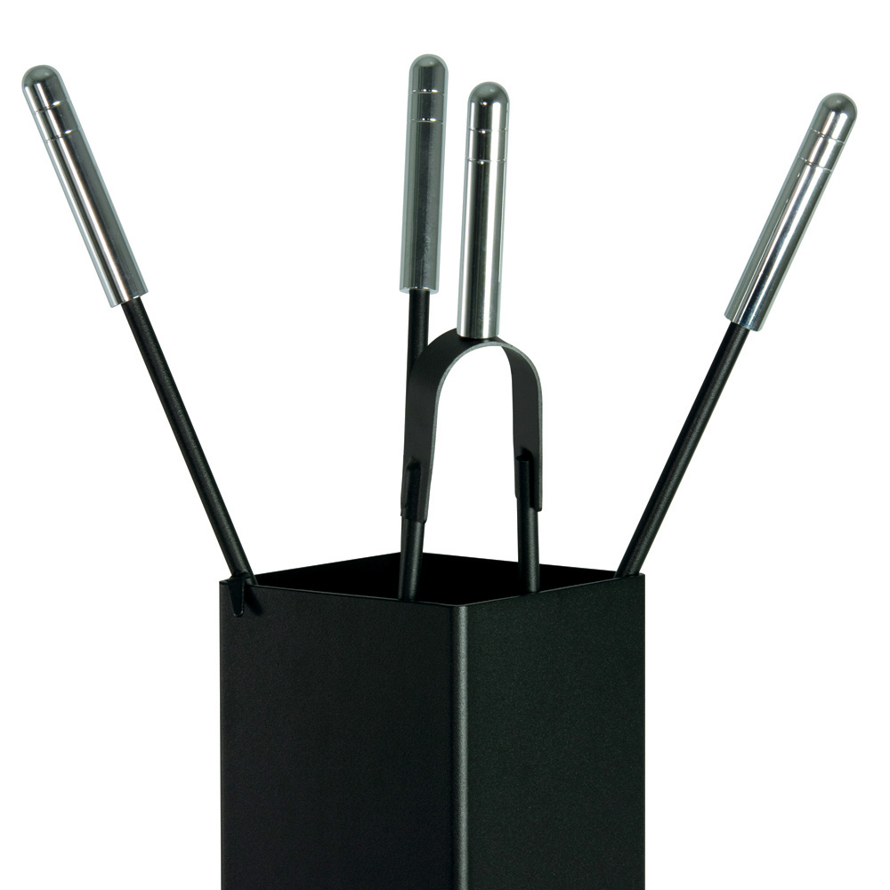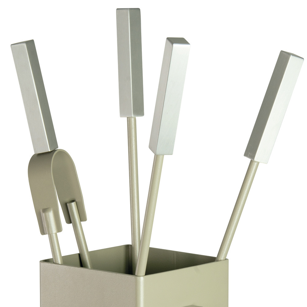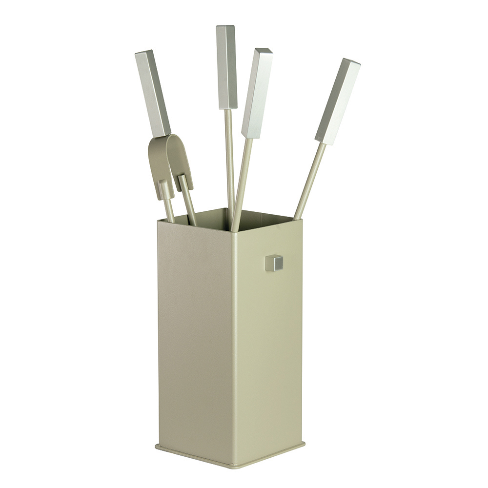 El juego incluye todo lo necesario para mantener el fuego acogedor y seguro. Las asas proporcionan un agarre seguro y cómodo . El diseño compacto del soporte permite colocarlo en cualquier rincón sin ocupar espacio, mientras que el refinado acento del botón en la cara añade un detalle visual distintivo.