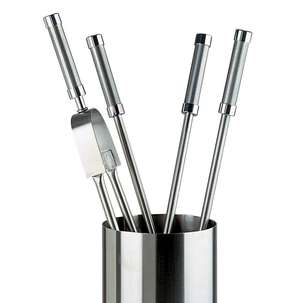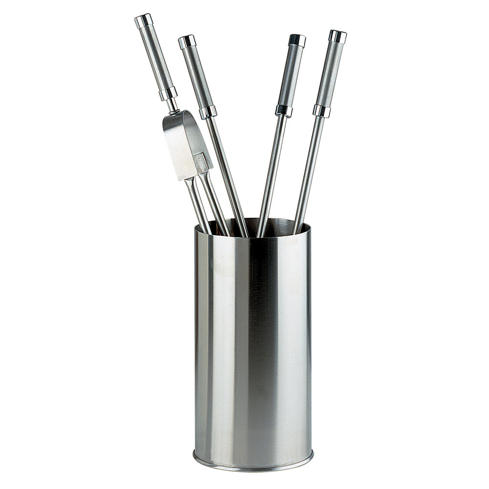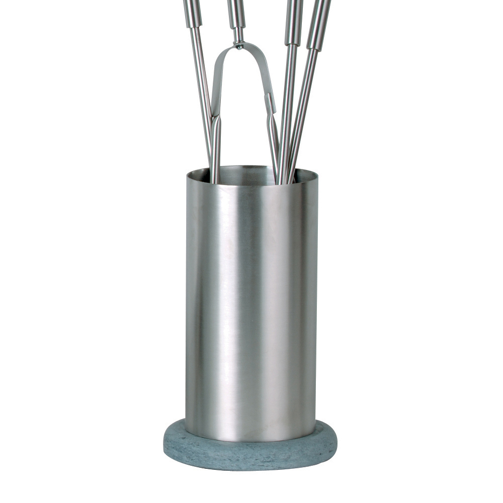 Resistente y duradero , este portaherramientas está diseñado para soportar el calor y el uso frecuente. Cada utensilio tiene un acabado con un mango que proporciona un agarre cómodo y seguro , lo que le permite manipular madera y cenizas con facilidad y estilo. El soporte cilíndrico garantiza que cada herramienta esté siempre ordenada y al alcance de la mano, sin renunciar a la elegancia.