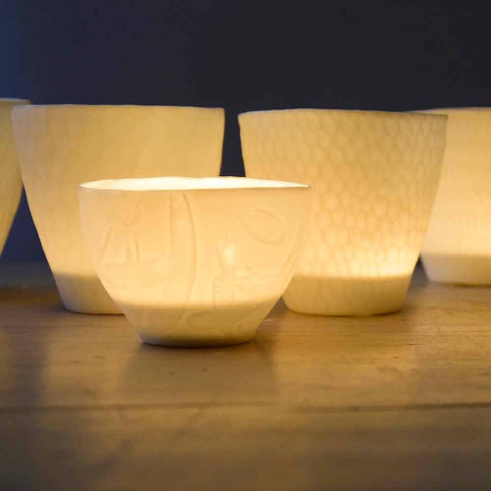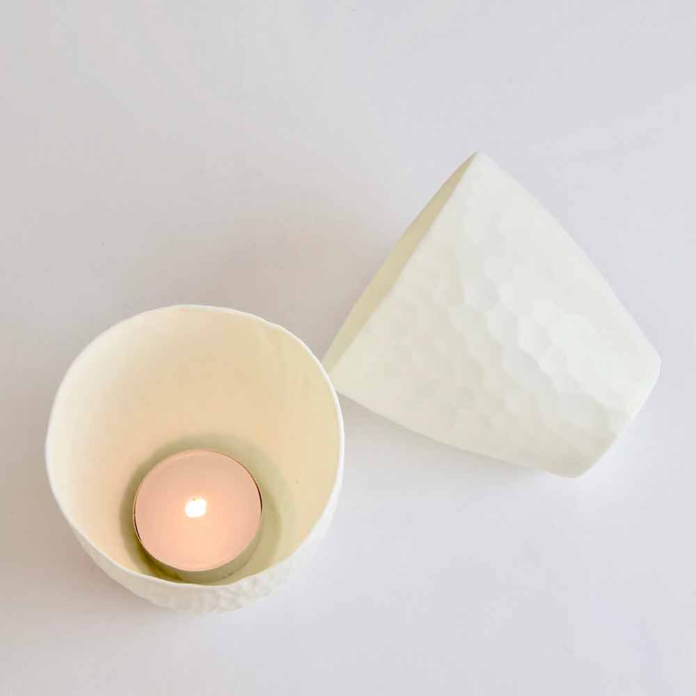 La porcelana es un material extremadamente resistente que se cuece a una temperatura superior a la de la cerámica tradicional, por lo que es más robusta y duradera, altamente resistente a las manchas e impermeable, gracias a su mayor densidad, dureza y uniformidad. Sus propiedades están garantizadas por la doble cocción hasta 1240 °, tras lo cual la porcelana muy translúcida adquiere un precioso color blanco cálido , que se calienta aún más una vez encendida la vela en su interior.