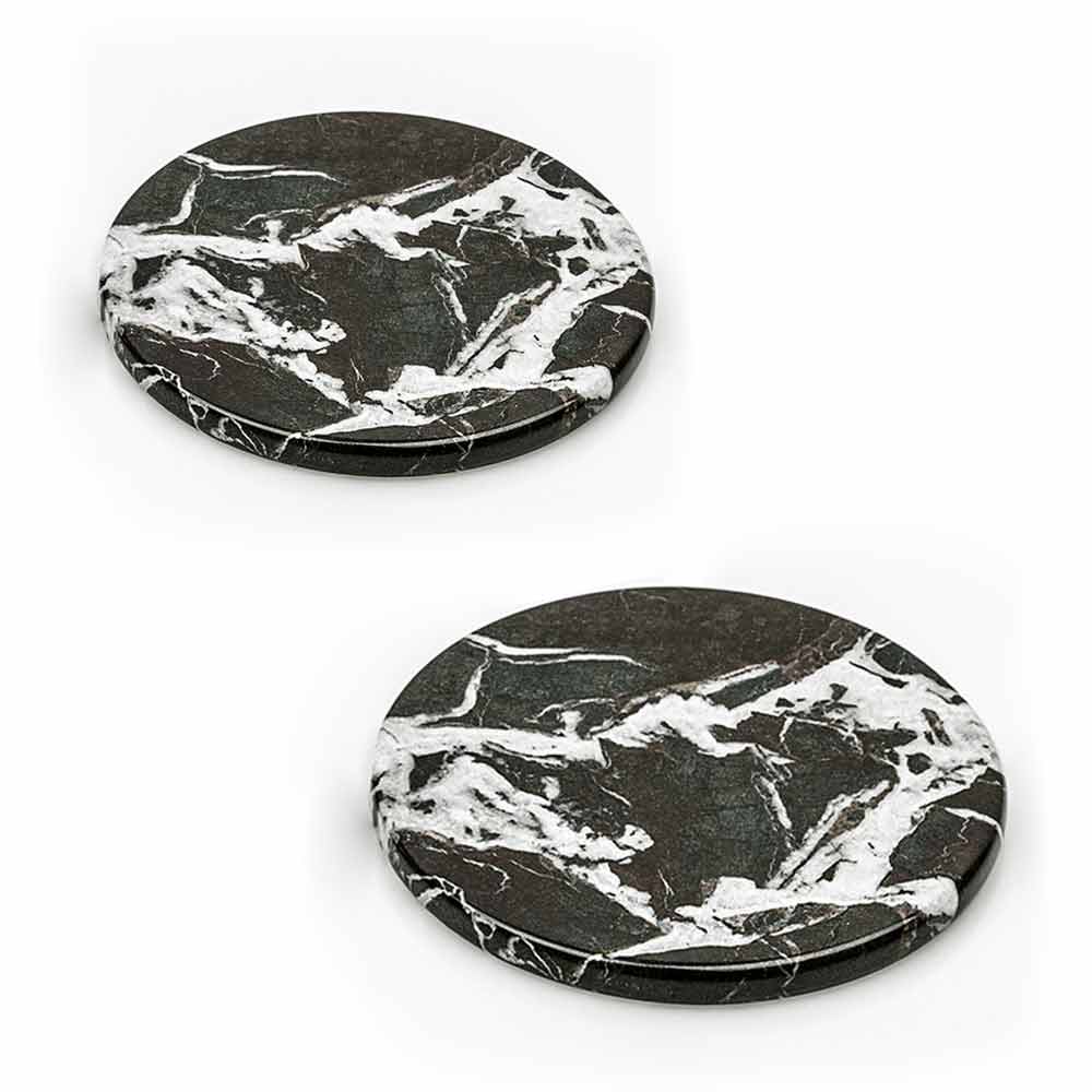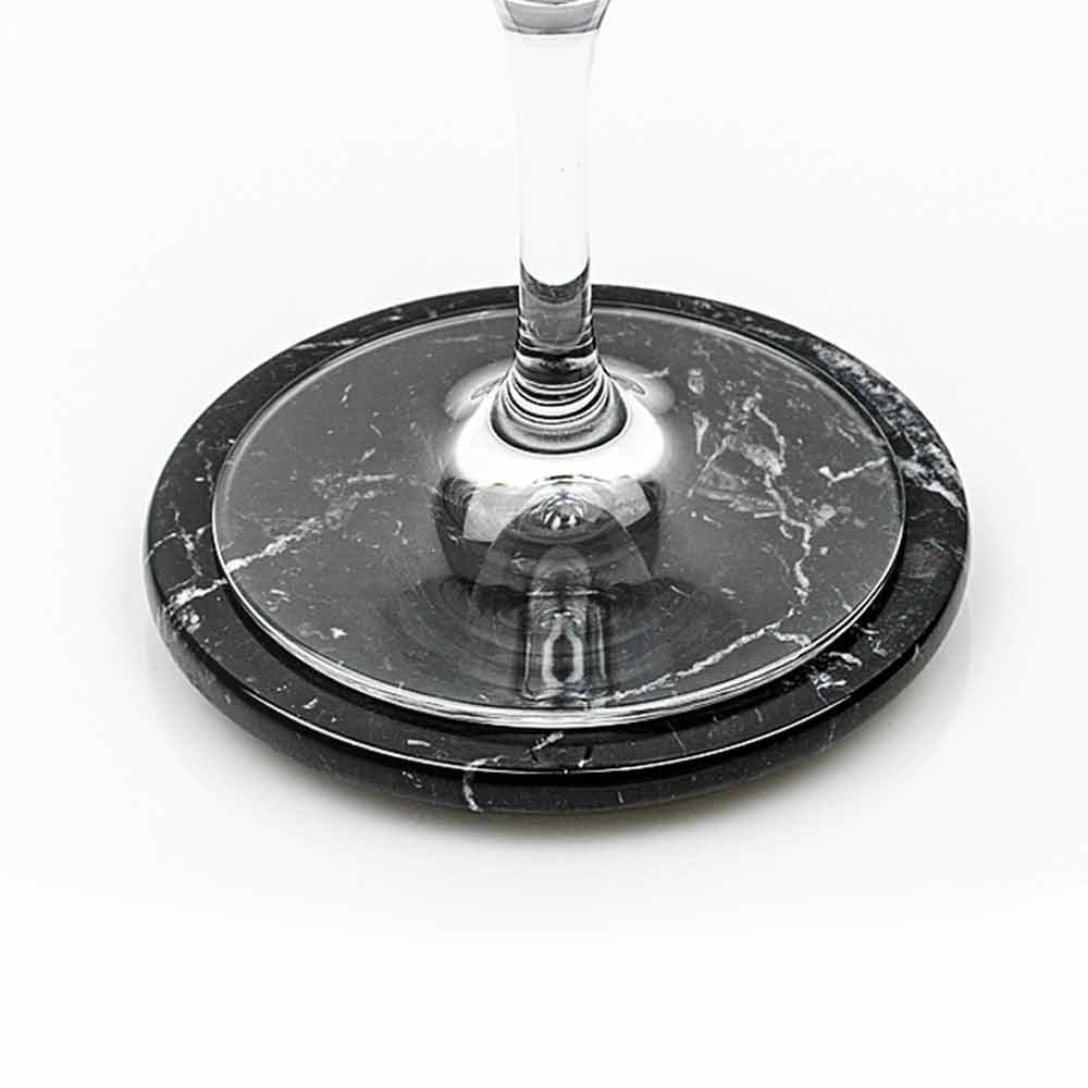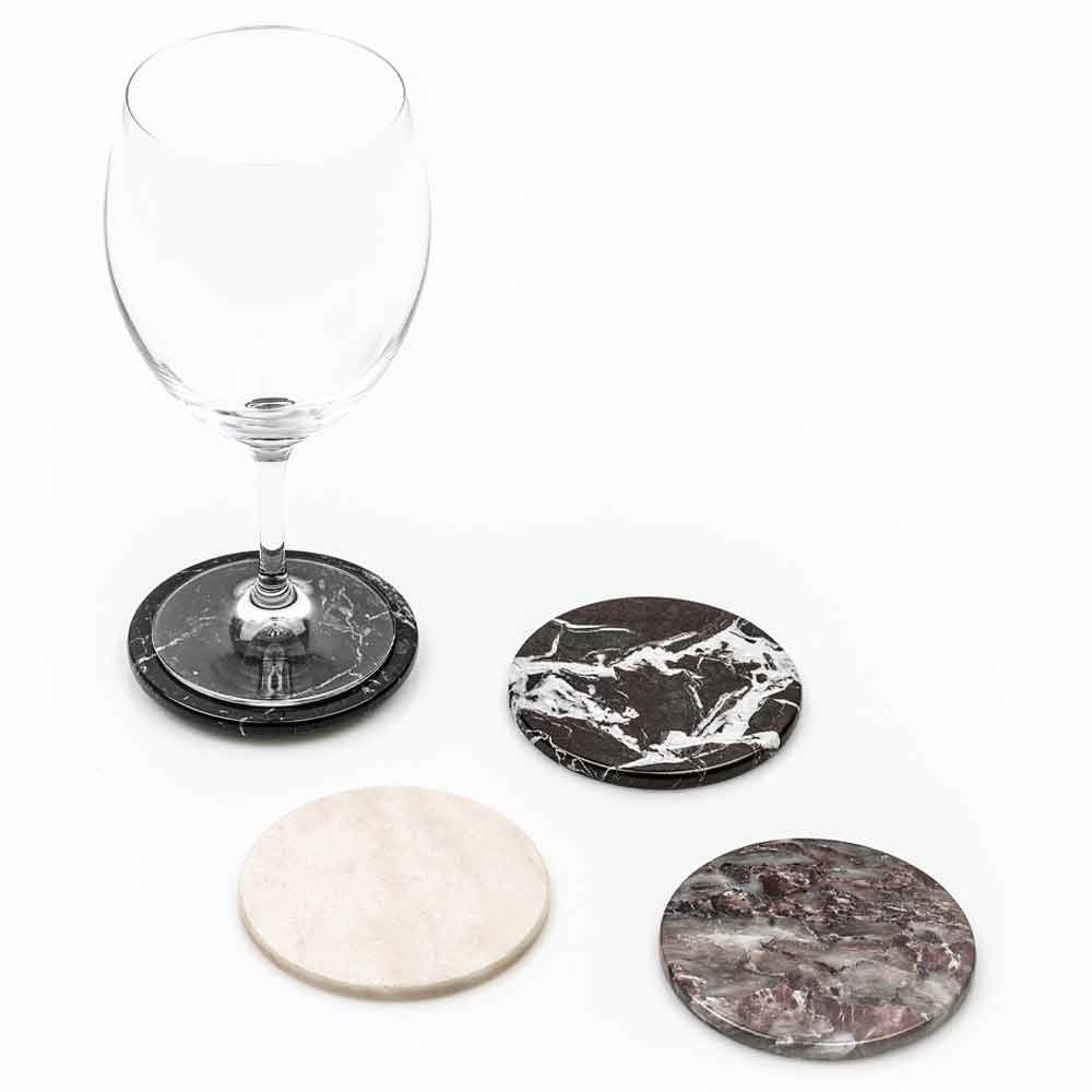 Dos posavasos redondos caracterizado por un diseño elegante e innovador y realizado en mármol precioso de alta calidad . Se trata de piezas únicas ya que cada bloque de mármol utilizado se diferencia de los demás en vetas y matices.