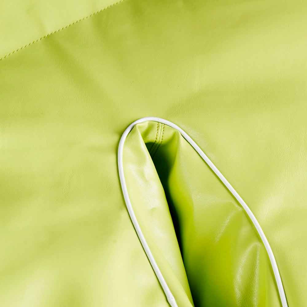 De ecopiel náutica hidrorepelente con borde canalé, este pouf tiene relleno en partículas de poliuretano expandido.