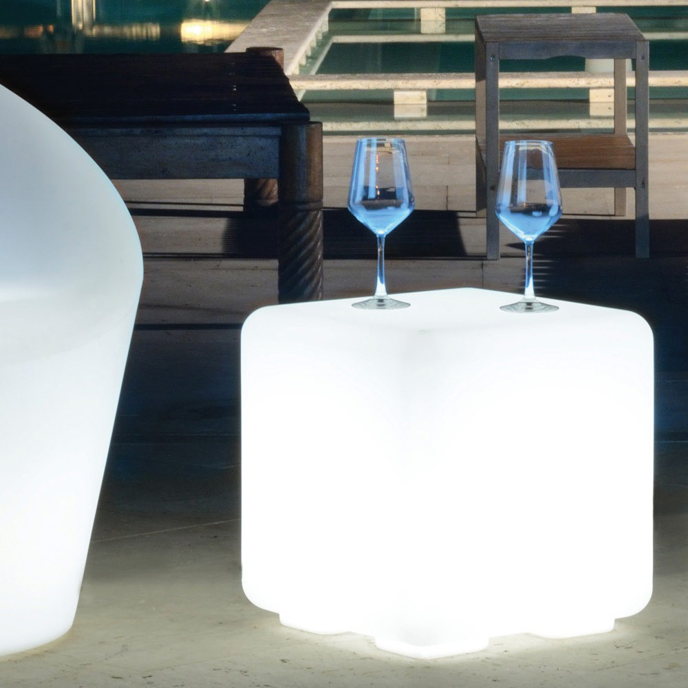 Puf / Mesita de polietileno coloreado también disponible en la versión con luz. Un mueble que se adapta a cualquier ambiente: en casa, en una sala de espera, en un jardín, junto a la piscina y muchas otras situaciones. Resiste todos los agentes externos : los rayos UV, las altas y bajas temperaturas, la lluvia y cualquier tipo de agente atmosférico no alteran su encanto, color y forma.
