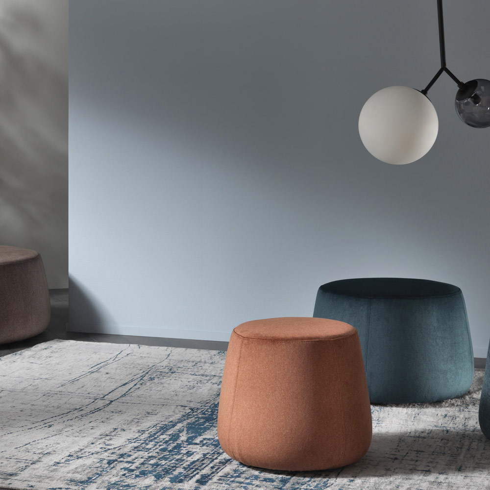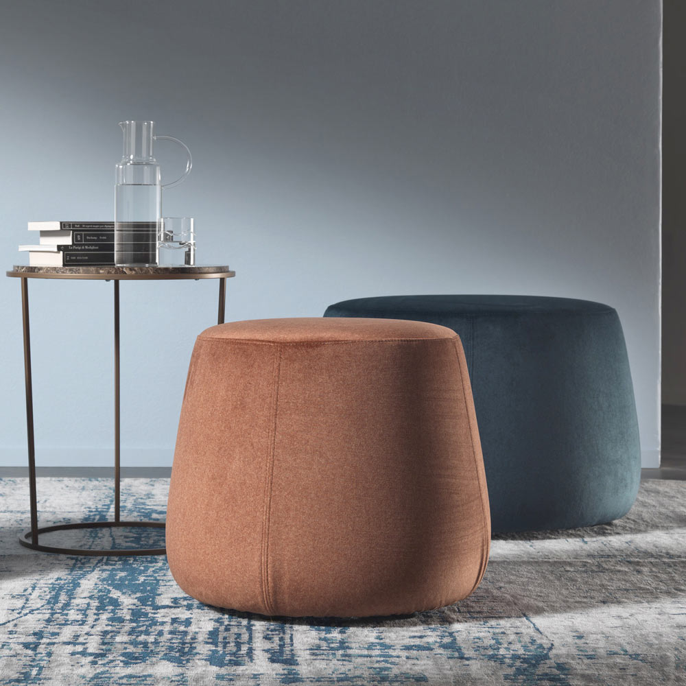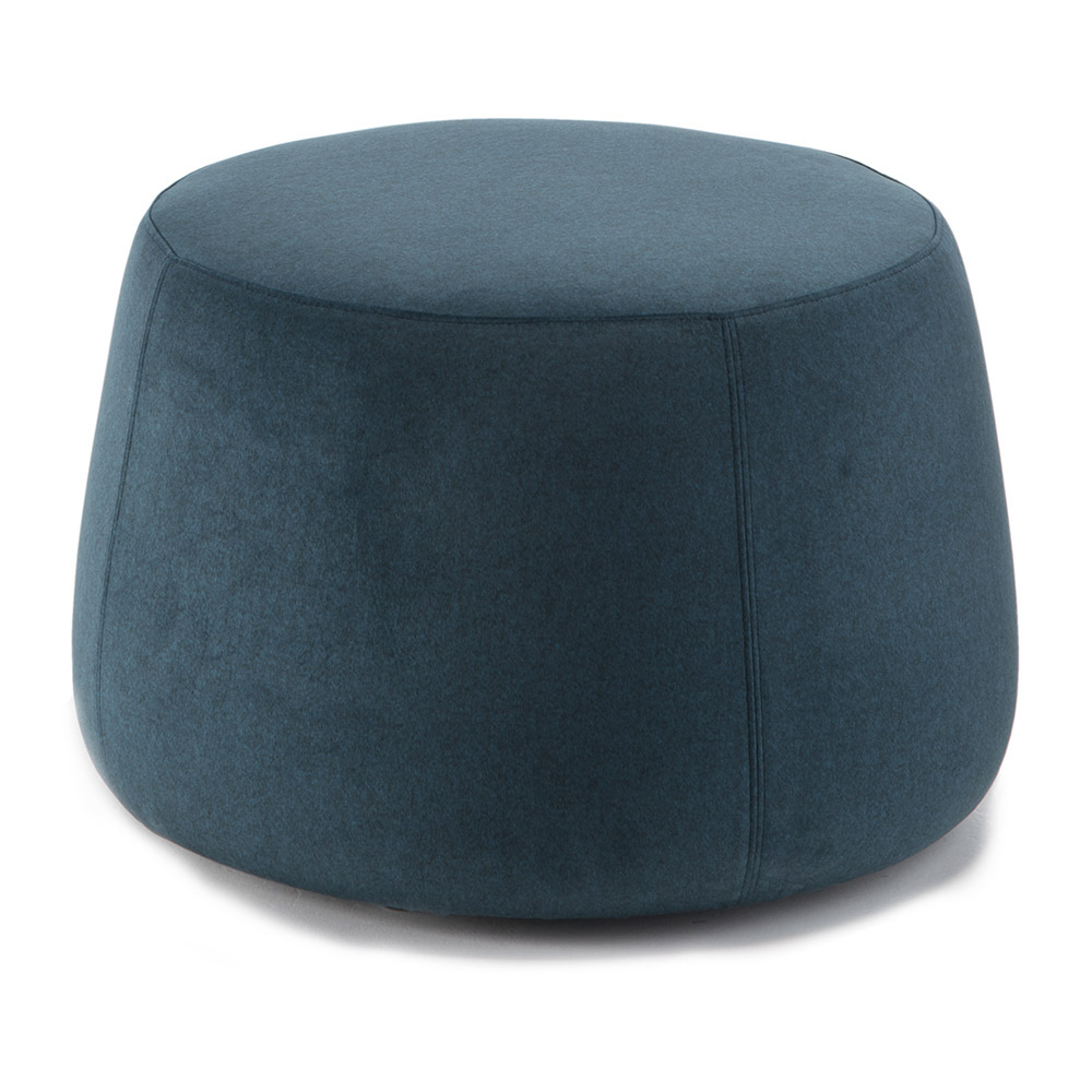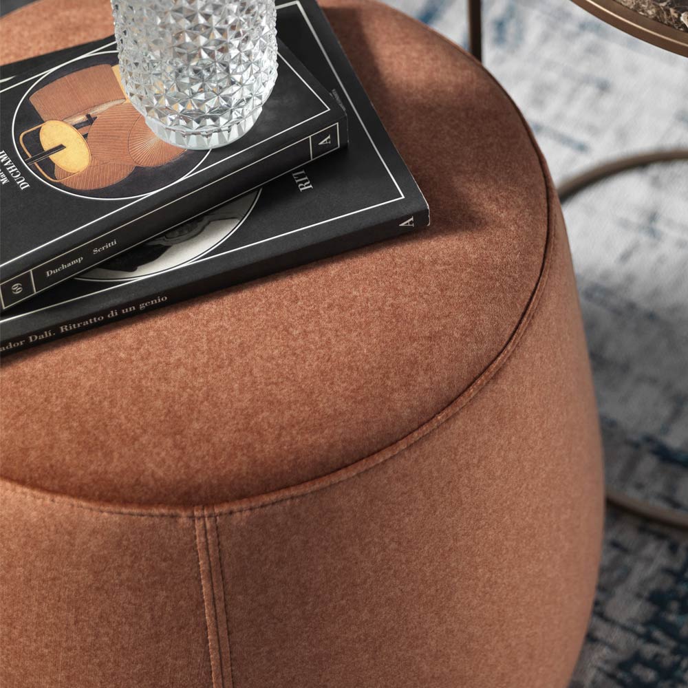El puf de diseño moderno y redondo disponible en tres anchos diferentes está completamente revestido en suave terciopelo extraíble disponible en 6 acabados.