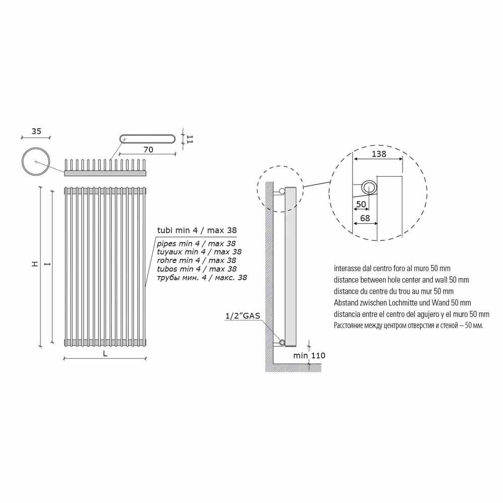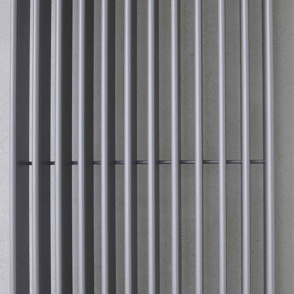 tubos planos verticales de 70 x 11 mm soldados perpendicularmente a los colectores de 35 mm de diámetro, para un diseño minimalista y moderno.
