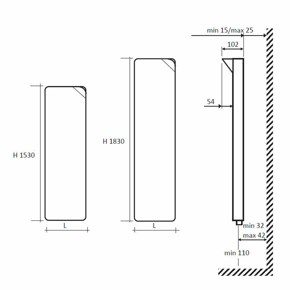 • H 1530 x L 375 x Inter. 50 x P 48 mm x Salida w (Δt50 °) 385; Rendimiento w (Δt30 °) 197; Rendimiento w (Δt26 °) 166