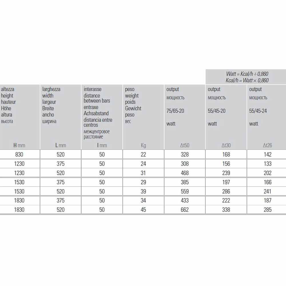 • H 1830 x L 375 x Inter. 50 x P 48 mm x Salida w (Δt50 °) 433; Rendimiento w (Δt30 °) 222; Rendimiento w (Δt26 °) 187