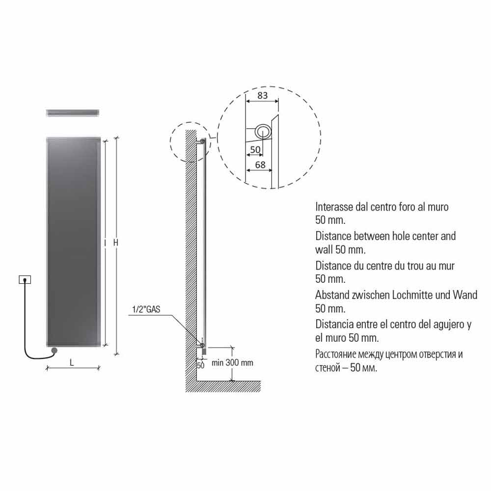 Se incluye la resistencia eléctrica con infrarrojos equipada con control remoto estándar, cable de 1200 mm con enchufe schuko y un suplemento de glicol para ser utilizado como anticongelante e inhibidor de óxido para la protección del sistema. Bajo pedido están disponibles la resistencia eléctrica digital y la tapa de resistencia en el mismo acabado que el radiador; o resistencia solo a la izquierda e insertada verticalmente en el radiador y receptor oculto, termostato de programación diaria / semanal y receptor de radiofrecuencia. La distancia entre centros se puede personalizar bajo pedido con una distancia de 50 mm a elegir entre centro o derecha. También está disponible la versión con instalación hidráulica del radiador. Póngase en contacto con nosotros para una cotización.