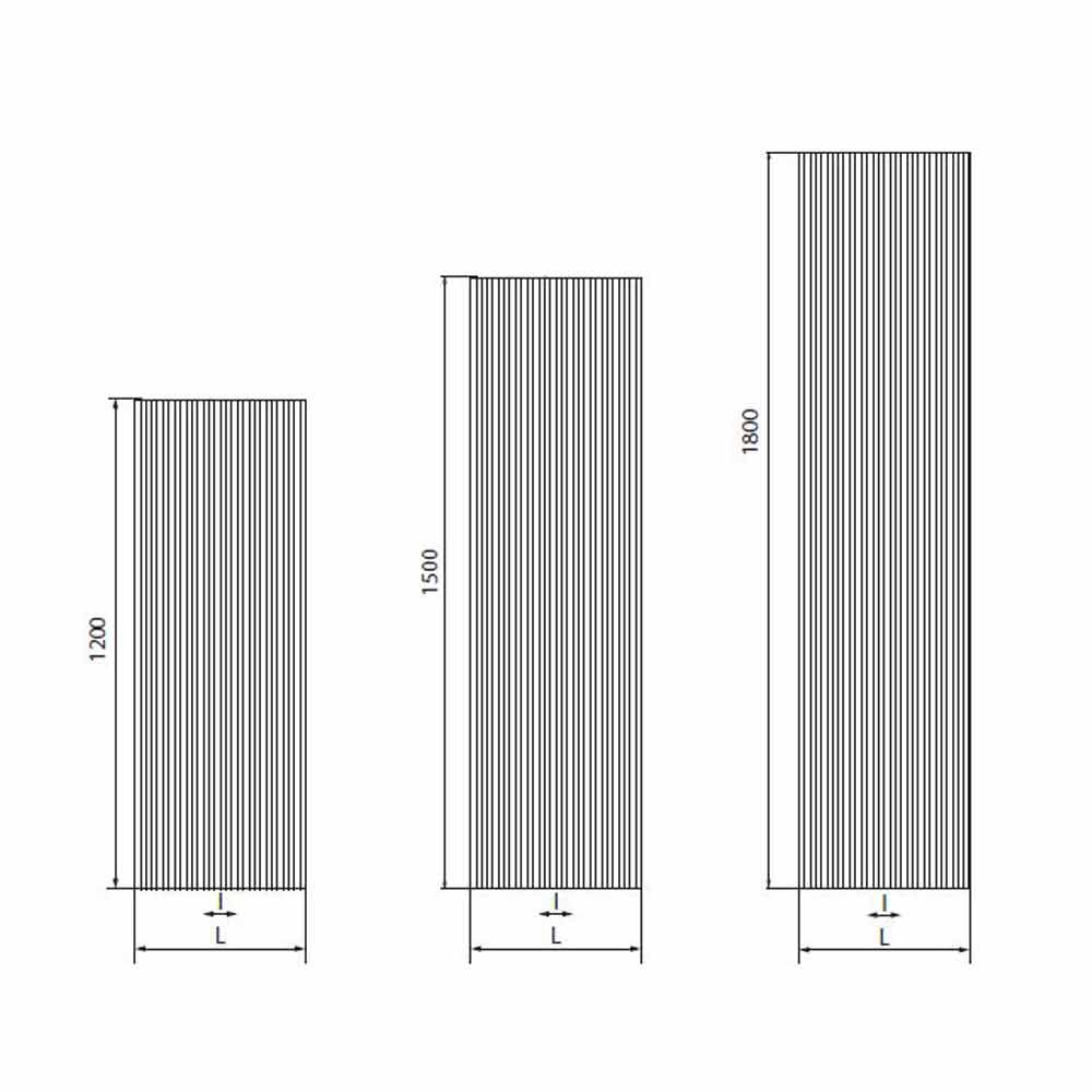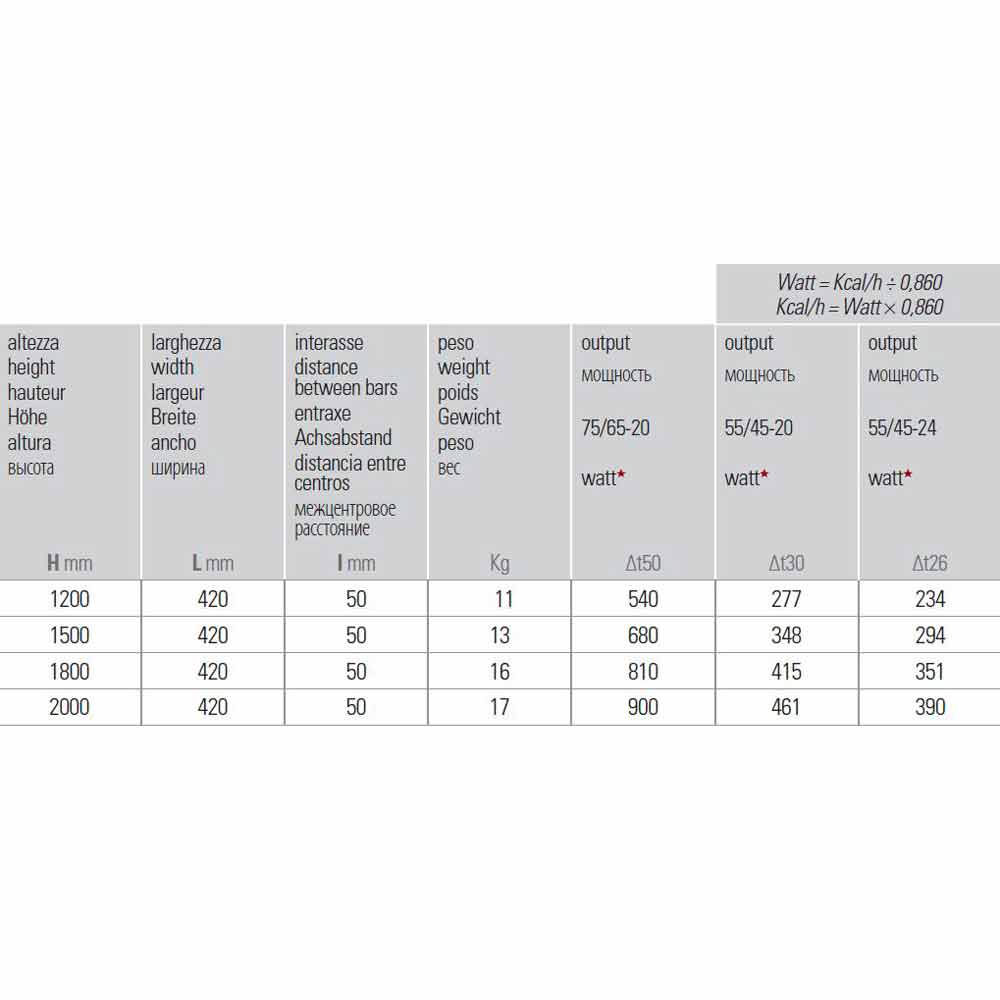 Disponible en diferentes tamaños *:- H 1200 x L 420 x Inter. 50 mm x Salida w (Δt50 *) 540; Rendimiento w (Δt30 *) 277; Rendimiento w (Δ26 *) 234;