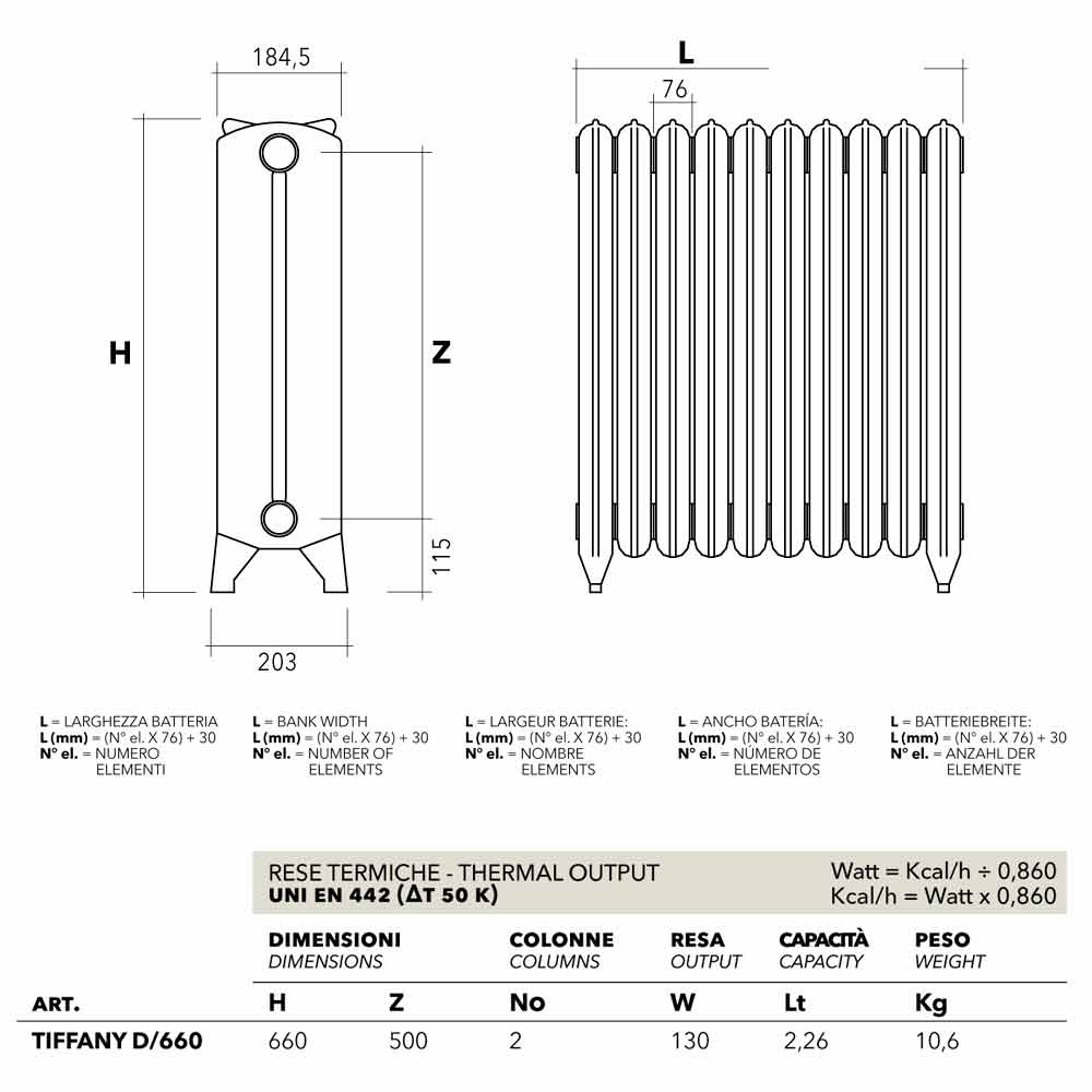 | Medidas | Medidas para un solo elemento: H. 660 mm, distancia entre centros 500 mm, Columnas 2, Potencia térmica 130 vatios, Capacidad 2.26 Lt, Peso 10.6 Kg |