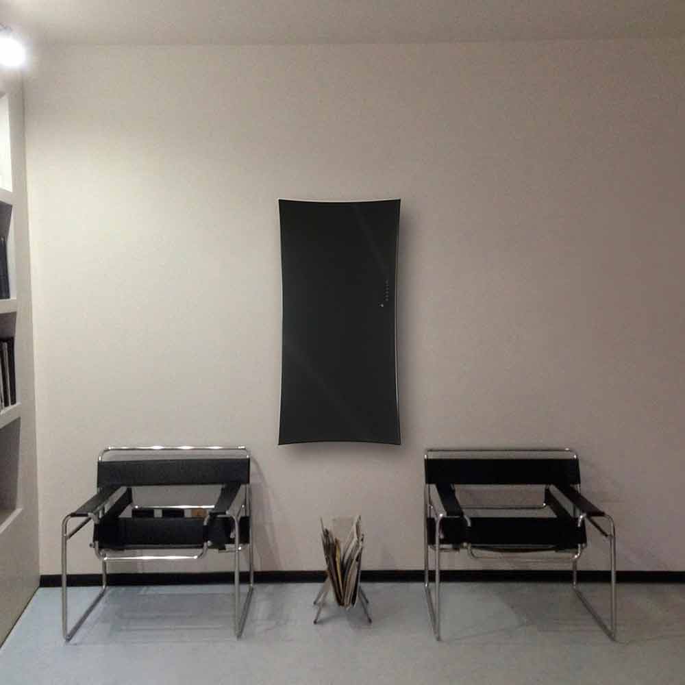 4- Seguridad : Al estar construida en vidrio templado, cuenta con la más alta certificación en vidrio de seguridad. La construcción inserta una película plástica adhesiva que permite que el vidrio obtenga la certificación europea B1 con prestaciones iguales a las de un vidrio laminado irrompible. Los soportes especialmente diseñados evitan, una vez que el producto ha sido instalado, su liberación involuntaria, de acuerdo con las normas de seguridad alemanas para radiadores. Este radiador eléctrico también permite seleccionar una temperatura superficial baja (50 °C) con el fin de evitar el contacto con superficies excesivamente altas de niños o personas mayores que puedan tocarlas o apoyarse inadvertidamente sobre ellas.
