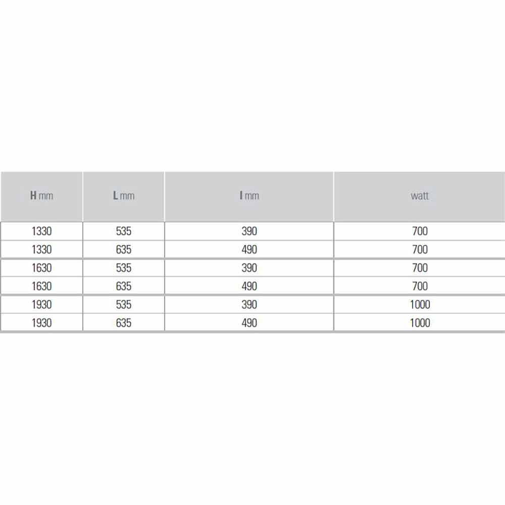 - H 1820 x L 535 x Inter. 460 x P 63 mm x Rendimiento w 1000;