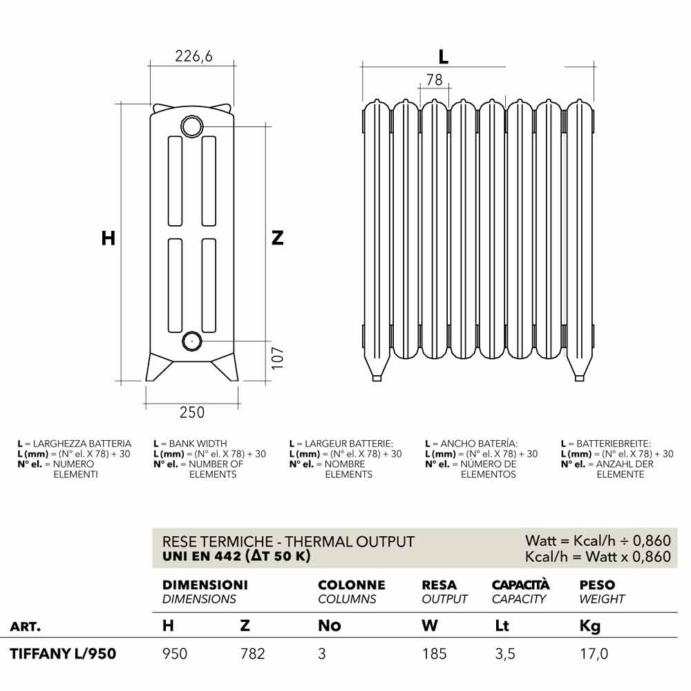 | Medidas | Medidas para un solo elemento: H. 950 mm, distancia entre centros 782 mm, Columnas 3, Potencia térmica 185 vatios, Capacidad 3.5 Lt, Peso 17.0 Kg |