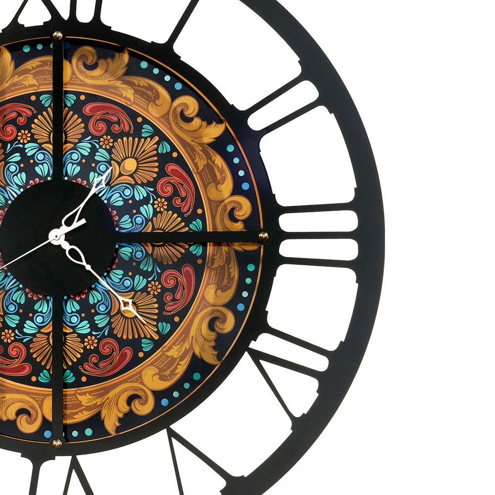 El reloj, con esfera de números romanos , combina la belleza tradicional con la robustez del hierro. La alegre decoración confiere al producto un aspecto único, sofisticado y cautivador. La decoración refinada y colorida está cuidadosamente distribuida por la esfera, dándole un aspecto único que atrae la atención de cualquiera que entre en la habitación. Los patrones y sombras evocan una sensación de calma y tranquilidad pero también energía y vitalidad.
