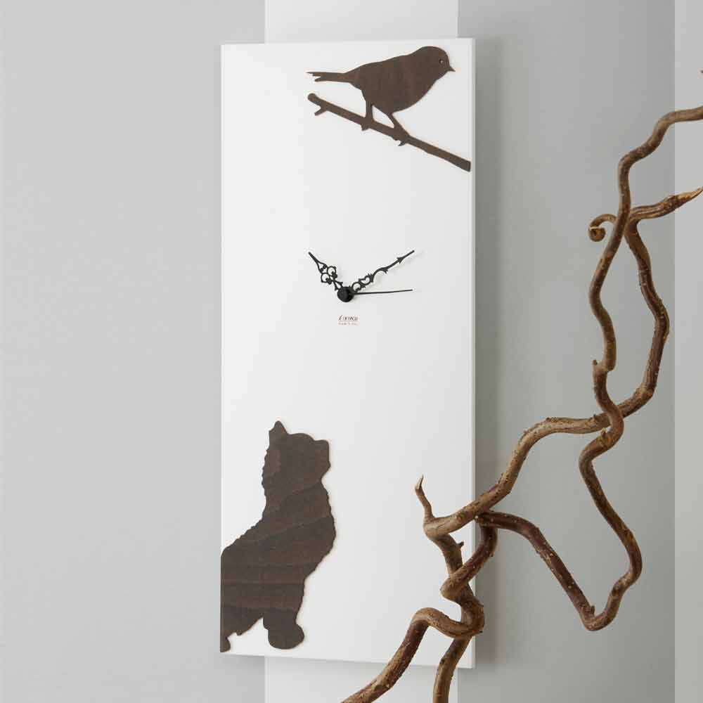 Reloj de pared rectangular en madera blanca mate con diseño de pájaros y gatos, diseño moderno hecho en Italia.