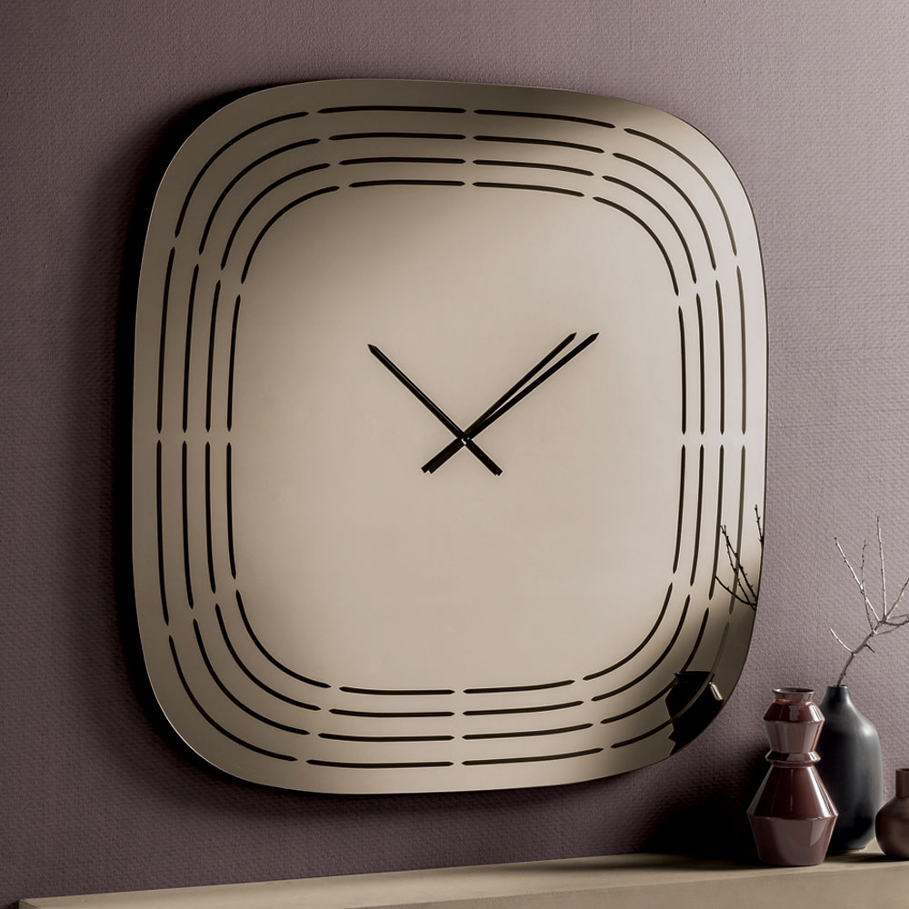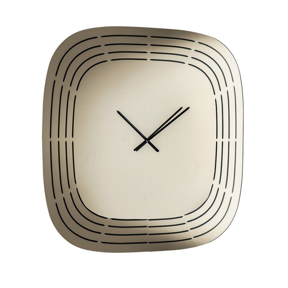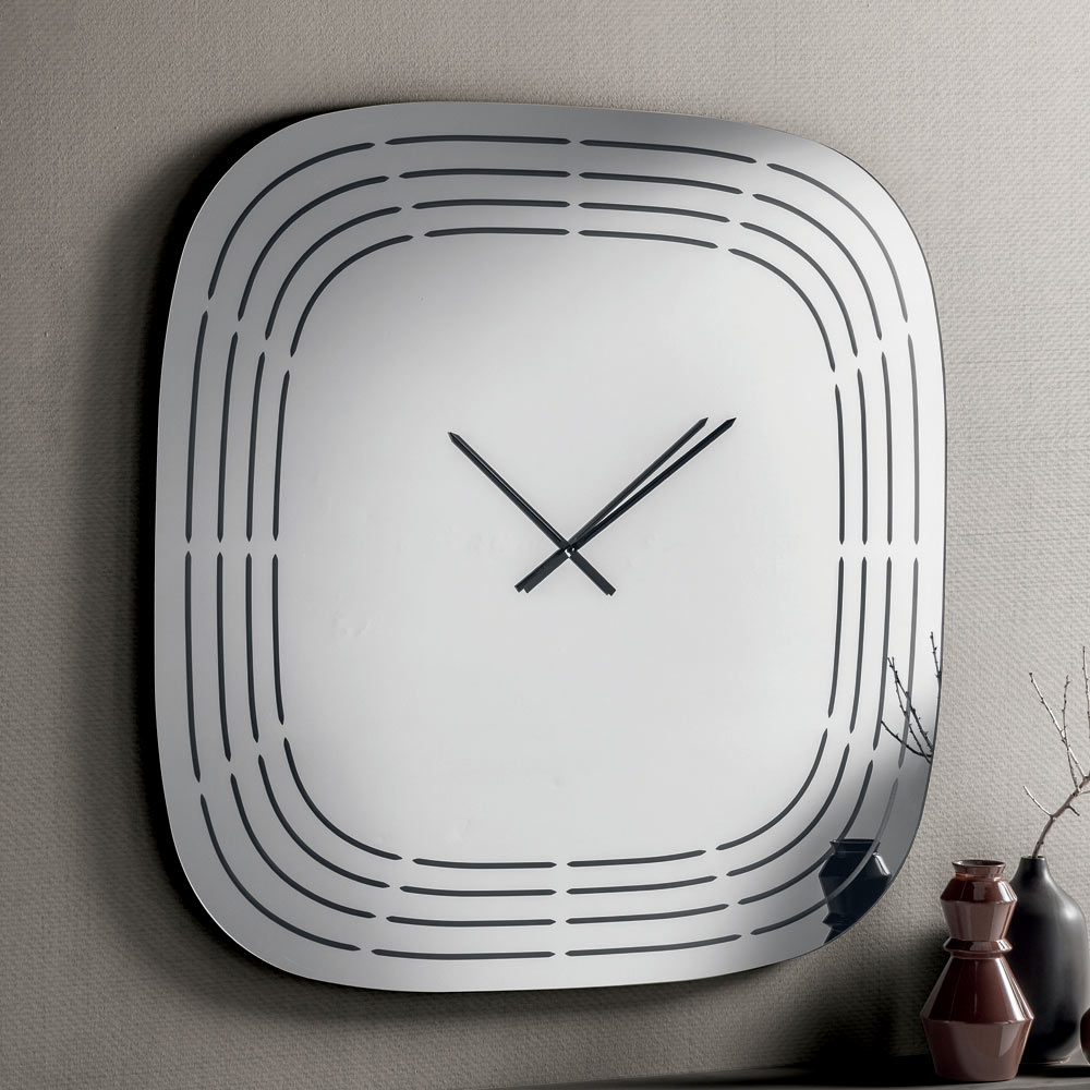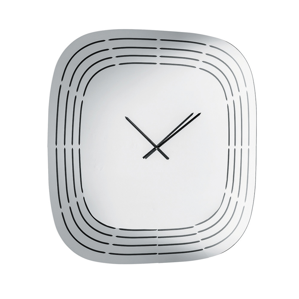 Fabricado en cristal espejado , este reloj presenta una forma cuadrada con esquinas redondeadas que suavizan su aspecto, logrando un equilibrio visual y un estilo moderno. La superficie está adornada con grabados láser que trazan líneas concéntricas siguiendo el perfil del reloj, dejando espacio en el centro para las manecillas y creando un refinado efecto gráfico.