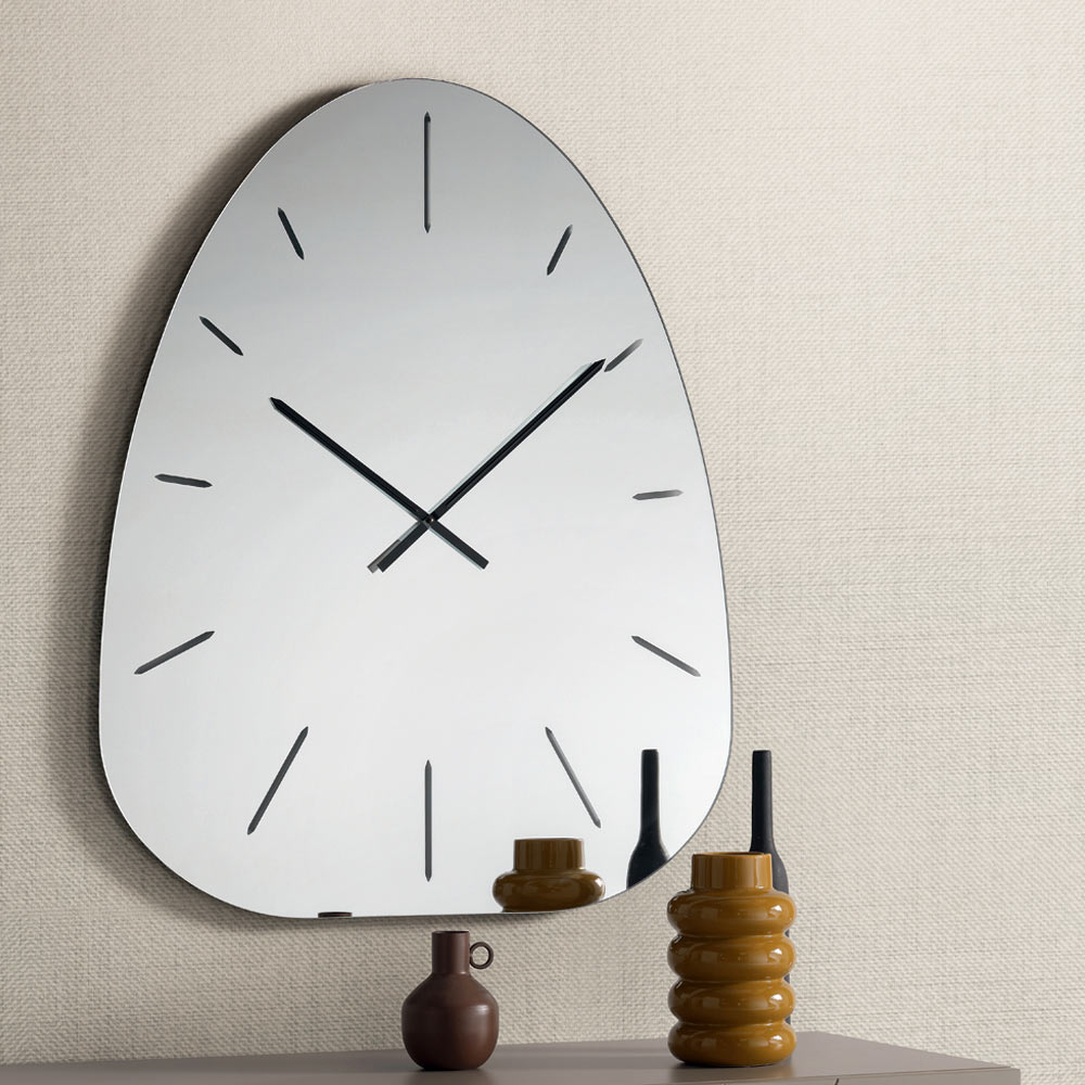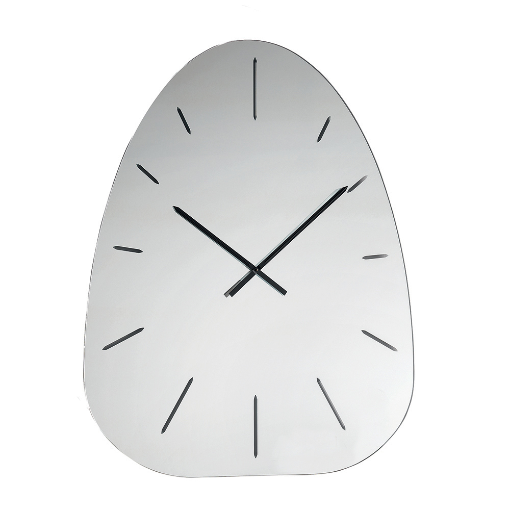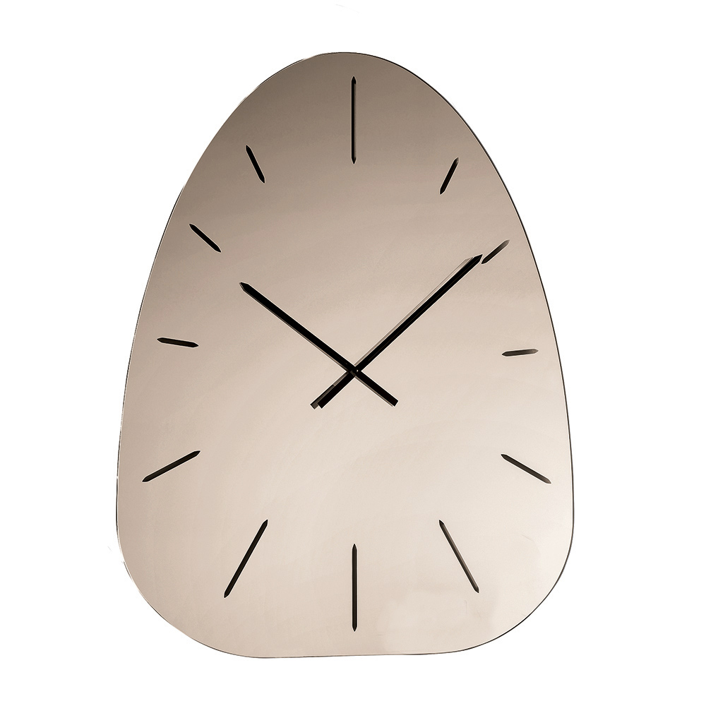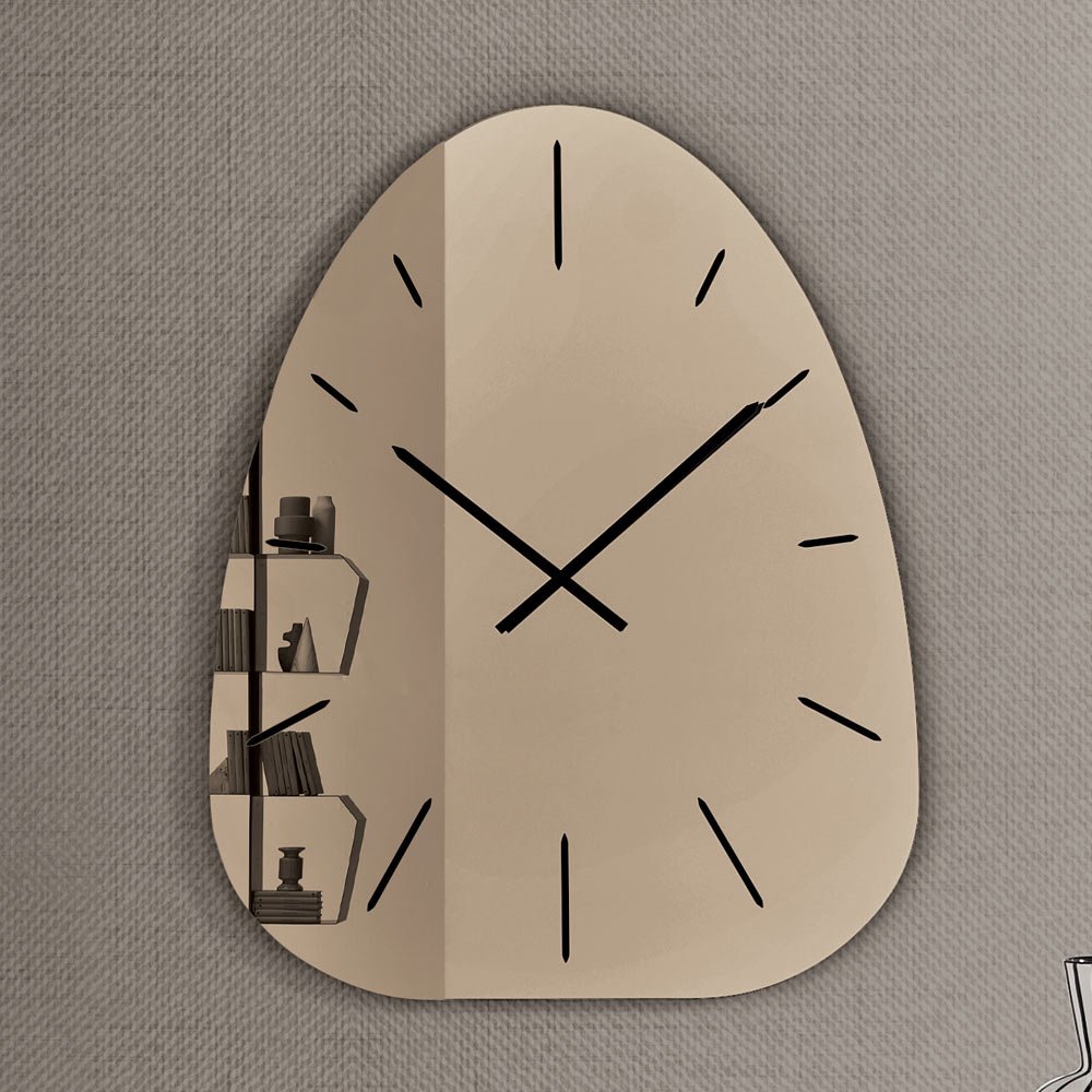 Fabricado en cristal espejado , el reloj destaca por sus números grabados con láser que emergen discretamente de la superficie reflectante, creando un refinado juego de luces y profundidad que varía a lo largo del día.