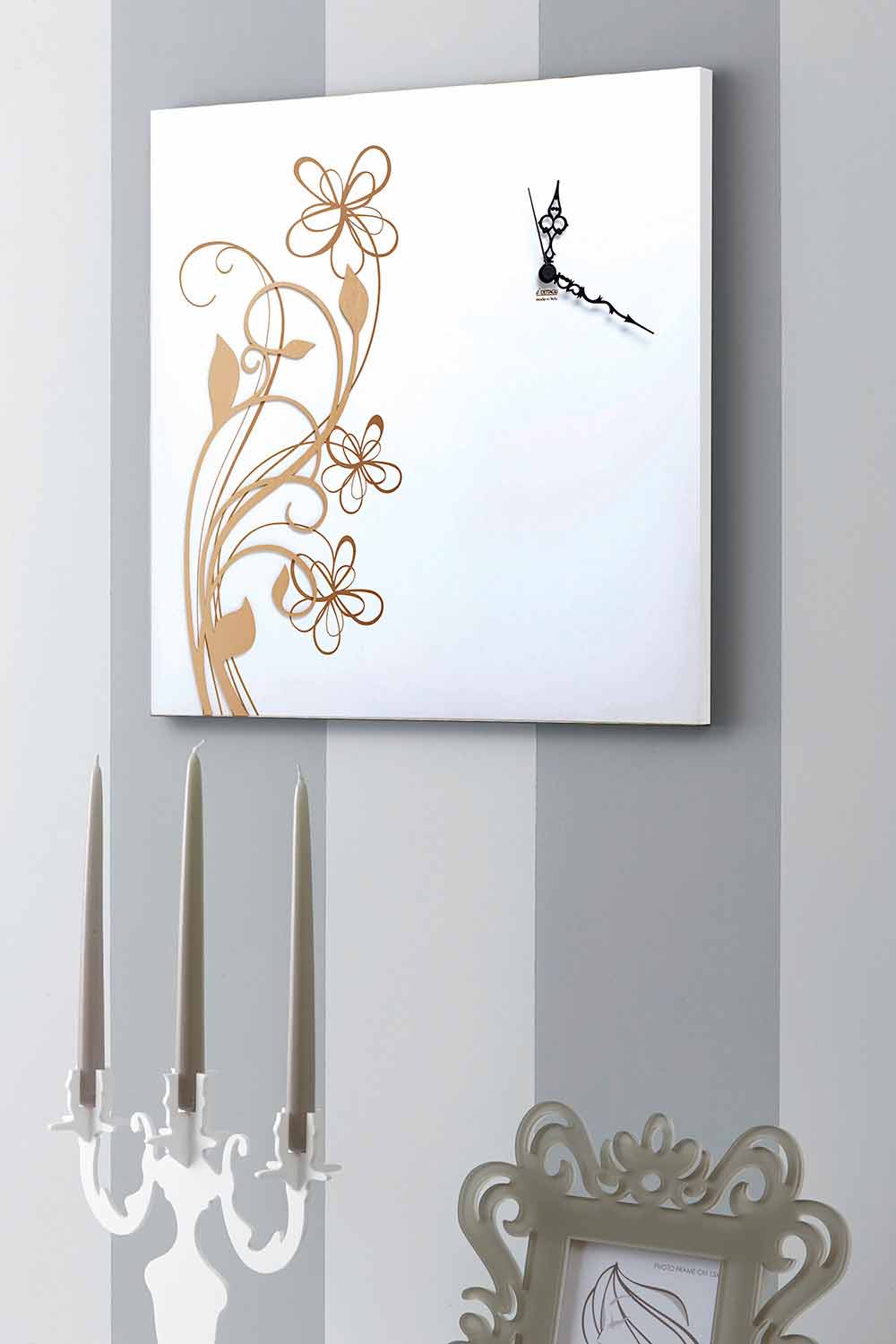 Reloj de pared de diseño cuadrado en madera blanca con decoración floral en madera natural, moderno y hecho en Italia.