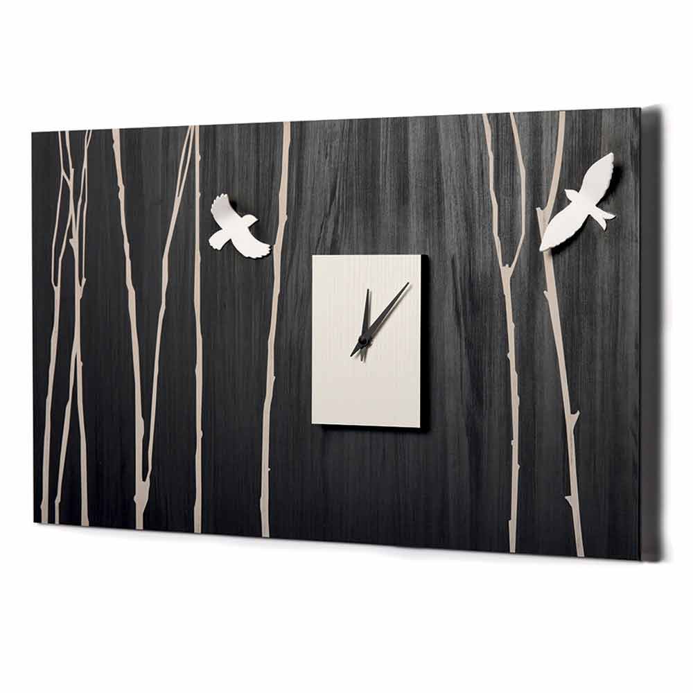 Este reloj de pared está hecha de madera de color pizarra con la representación de las ramas de invierno marcadas con láser y decoraciones tridimensionales, como la casa del pájaro de madera y las aves en metacrilato opaco. El diseño de este complemento está inspirado en el minimalismo de los países nórdicos , para una apariencia elegante y sobria.