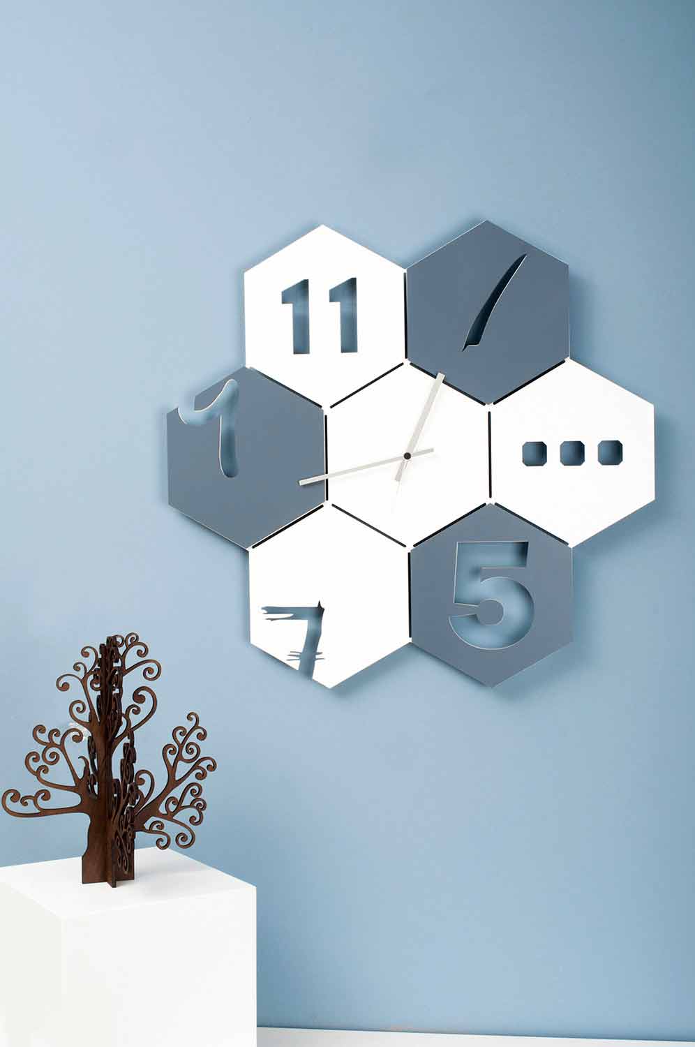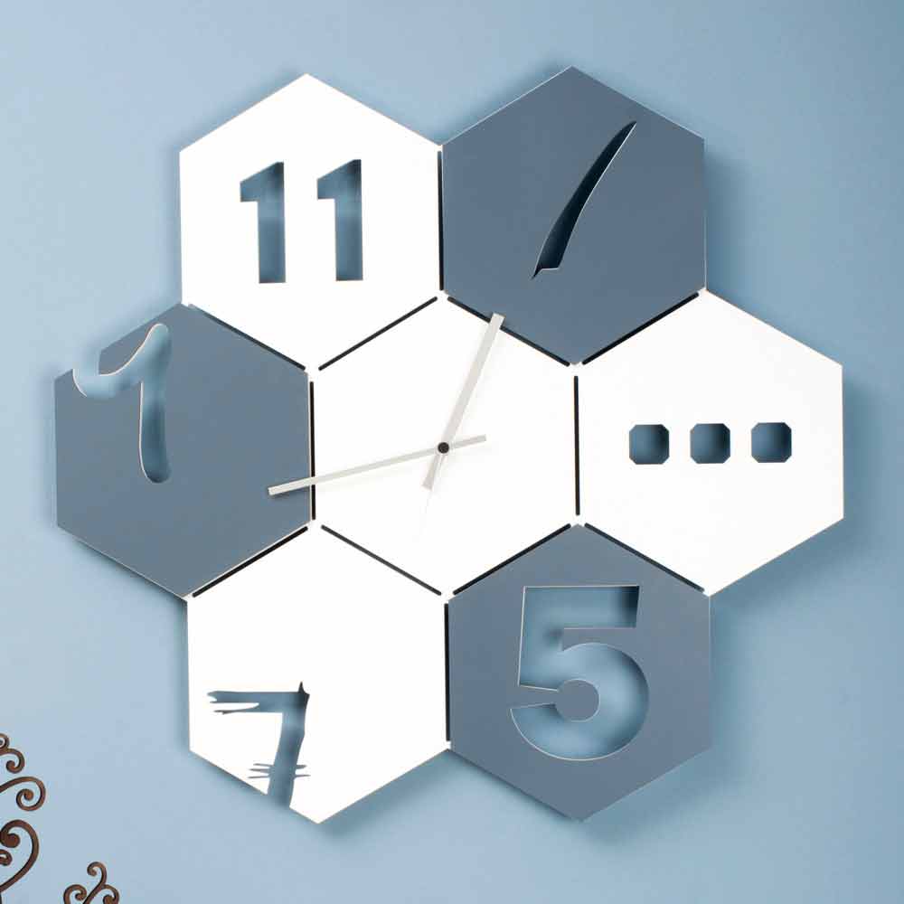 Gran reloj de pared, diseño compuesto por hexágonos en madera blanca y de color made in Italy.