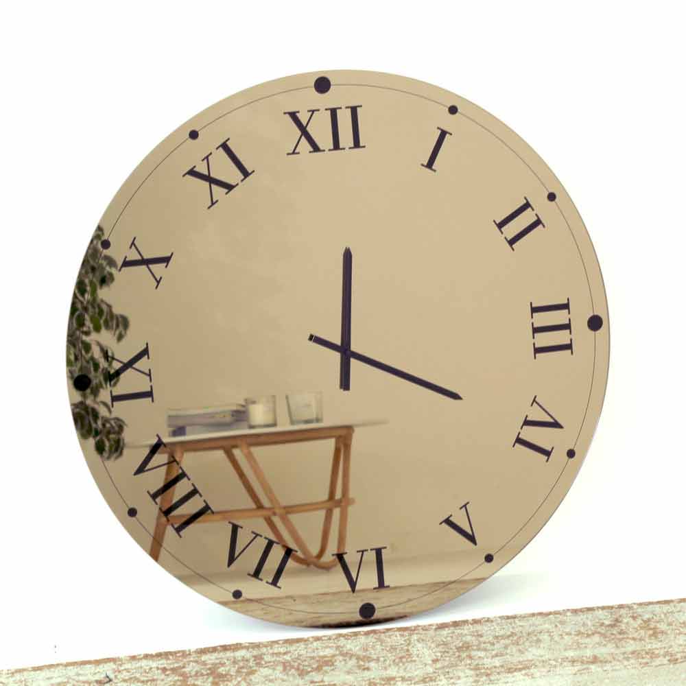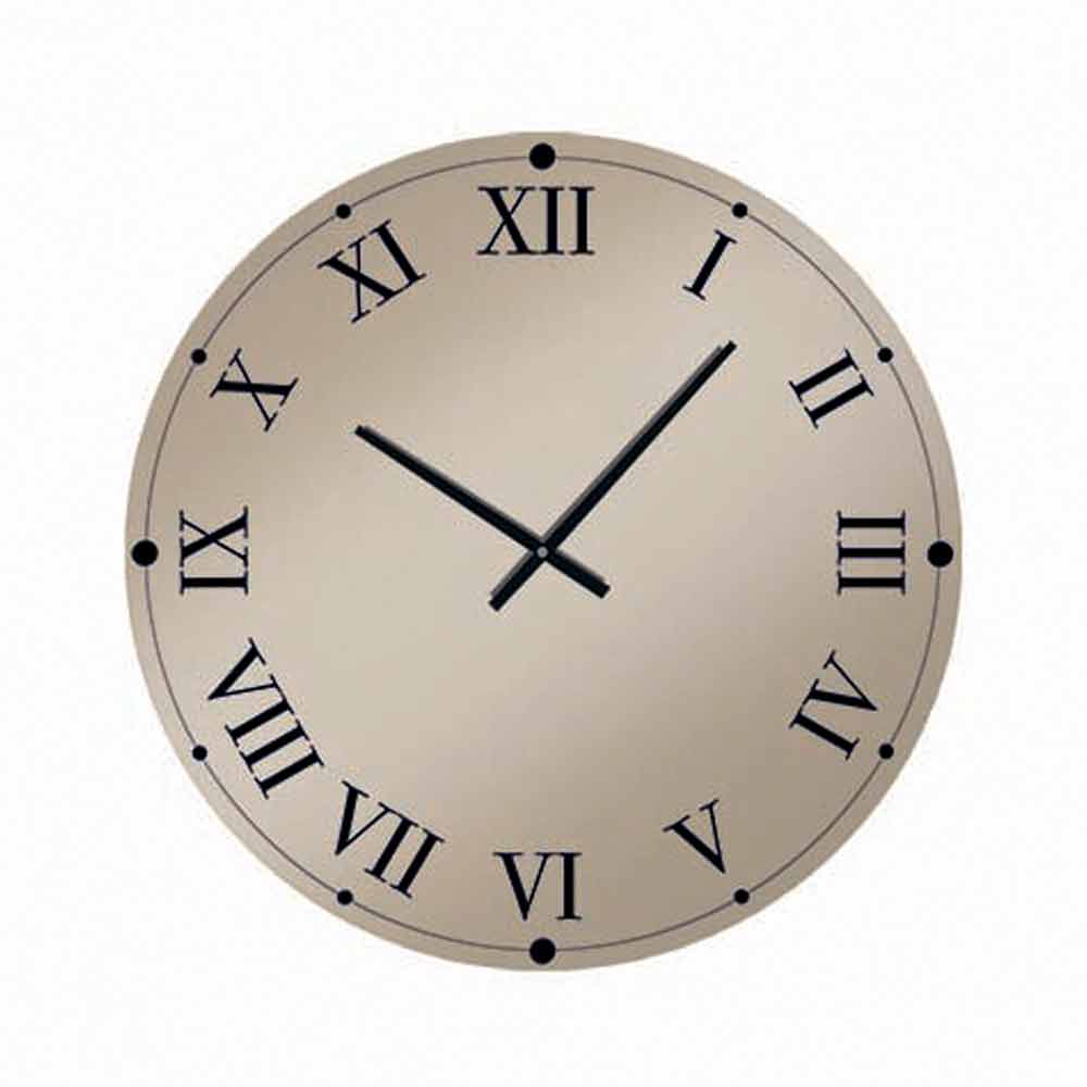 Reloj de pared redondo Made in Italy realizado en cristalespejado con números romanos y agujas negras. El uso del acabado espejado hace de este mueble la fusión perfecta entre un espejo y un reloj real, desempeñando una función sumamente útil y al mismo tiempo actuando como un maravilloso punto de luz, ayudando a agrandar ópticamente los espacios. Su diseño se caracteriza por la elegancia y la esencialidad , características de las que nace un artículo de clase, ideal para los más variados ambientes modernos, dando un toque personal y creativo a los muebles y aumentando su valor estético.