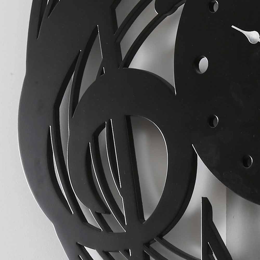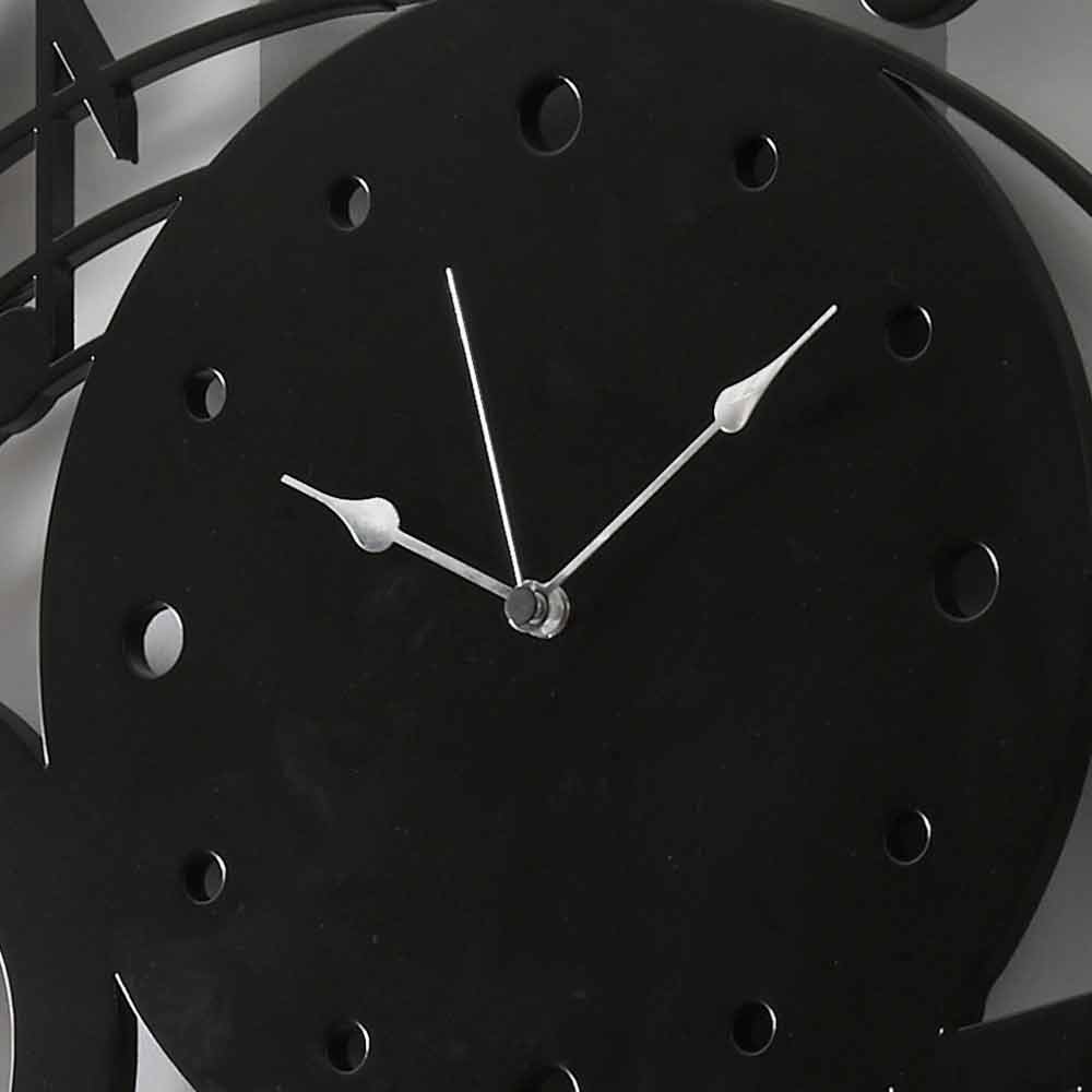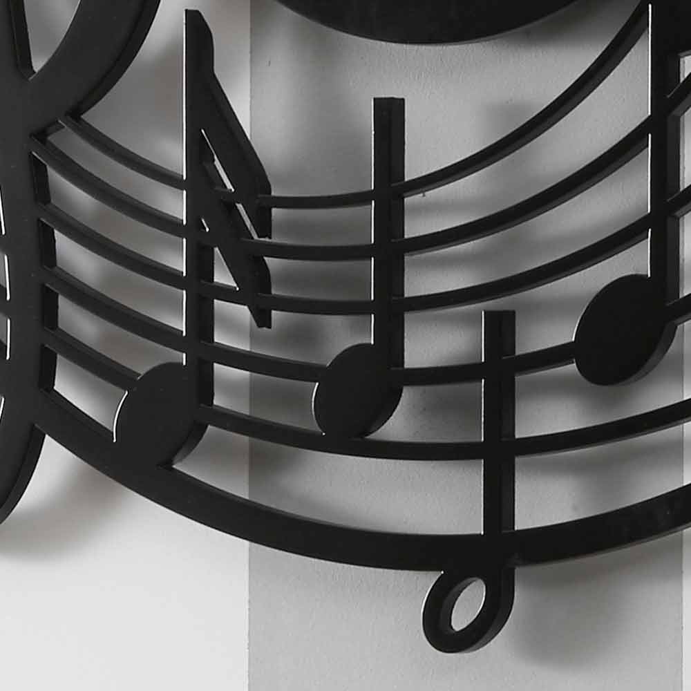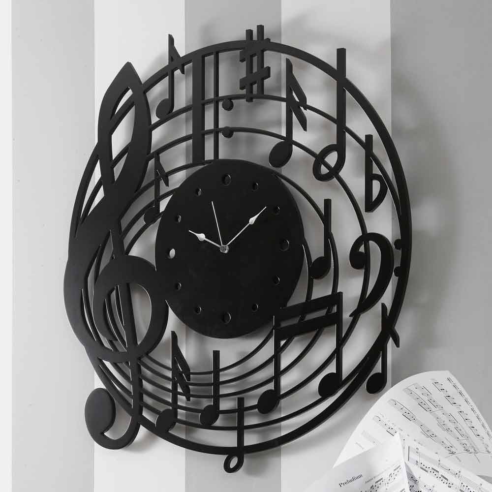 Gran reloj de pared, diseño redondo y moderno con notas musicales en madera negra y hecho en Italia.