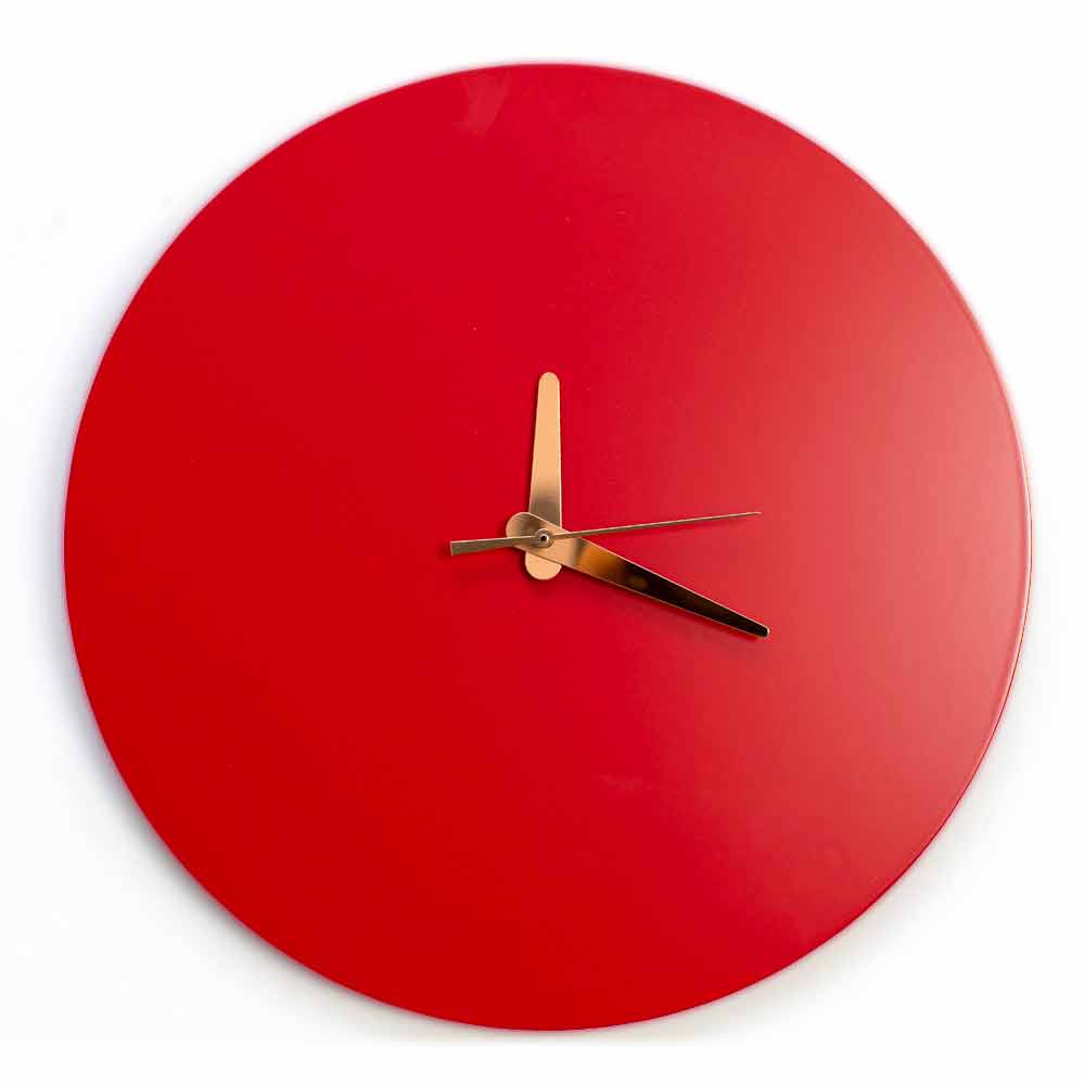 Reloj de pared en madera lacada en rojo y bronce, diseño redondo y moderno, hecho en Italia.