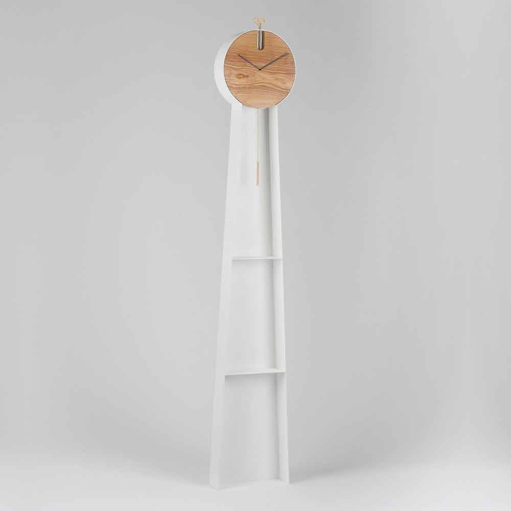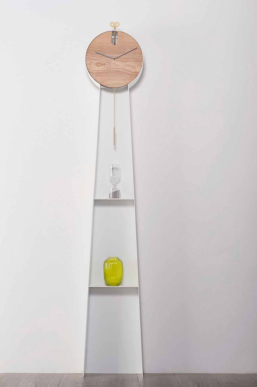 Este reloj de péndulo de suelo es un objeto innovador que combina un diseño innovador y extremadamente moderno con un toque más clásico que le da la llave de cuerda de latón típica de los relojes de péndulo antiguos. Su estructura está totalmente hecha a mano en Italia en acero pintado RAL y cuenta con dos prácticos estantes ideales para colocar objetos de decoración que pueden dar aún más personalidad y carácter al producto. En cambio, el reloj está hecho de madera maciza de fresno que, junto con el acero, le da una estética refinada y moderna.