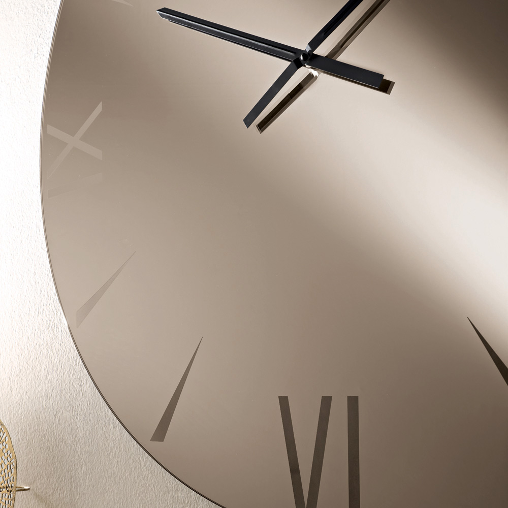Fabricado en cristal espejado , el reloj destaca por sus números grabados con láser , interpretados con precisión gráfica y sutileza visual. La superficie reflectante capta la luz y amplifica el espacio, creando un refinado juego de profundidad y reflejos.