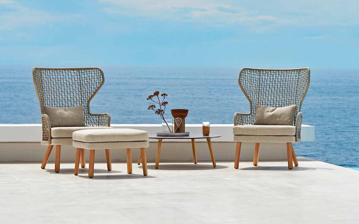 Emma es un encantador reposapiés de jardín caracterizado por una sólida estructura de madera de iroko y un asiento acolchado con caucho Dryfeel cubierto de tela.