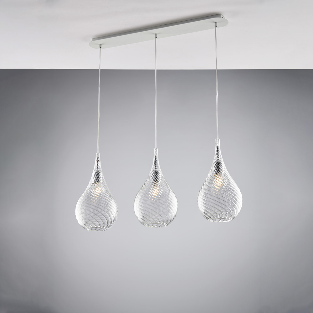 Elegante y funcional, esta lámpara colgante de riel de hierro artesanal con cristal Pyrex es una solución de iluminación contemporánea, diseñada para realzar los espacios con equilibrio y ligereza. Los tres sinuosos y refinados difusores de cristal Pyrex están suspendidos sobre un riel lineal que garantiza una distribución uniforme de la luz y un gran impacto estético.