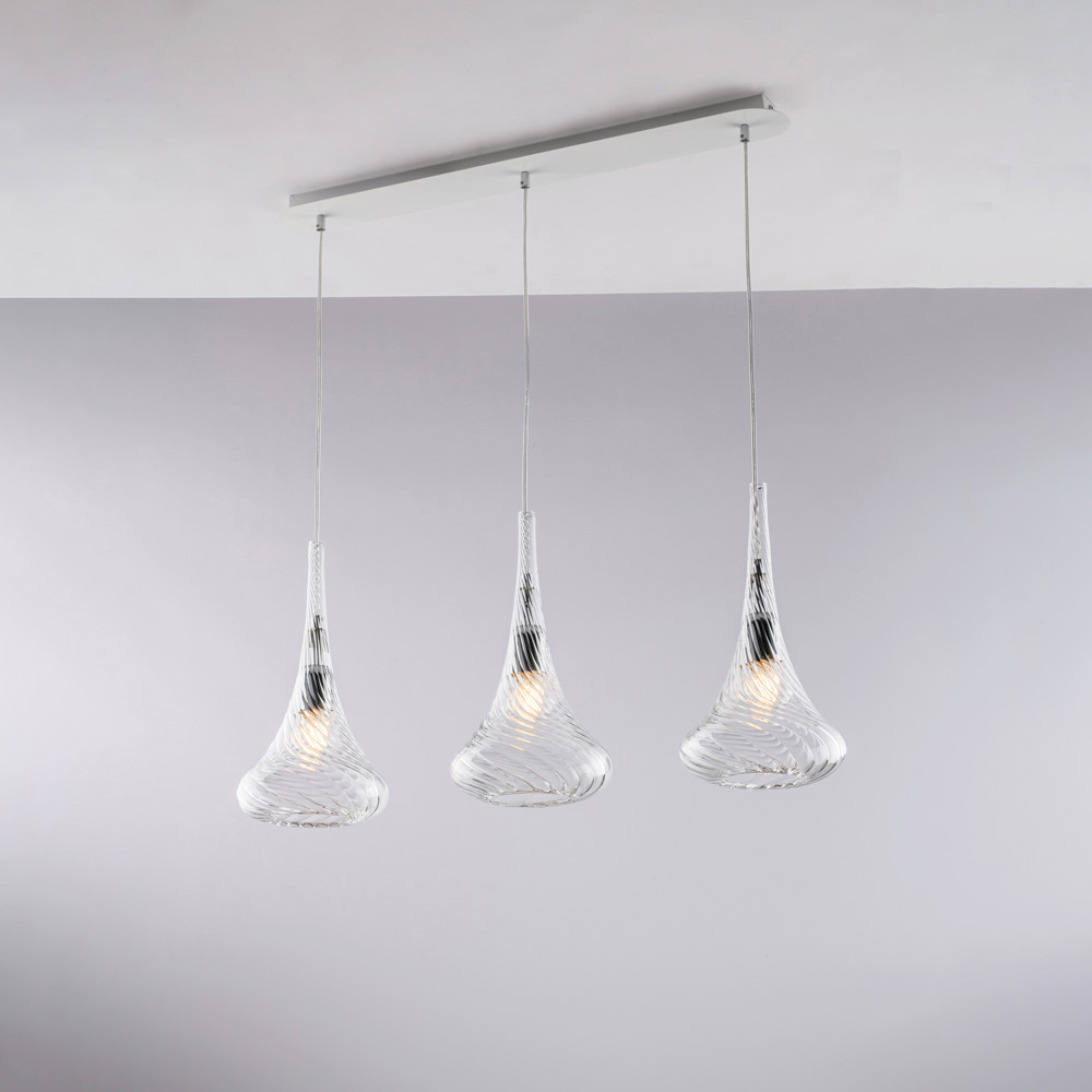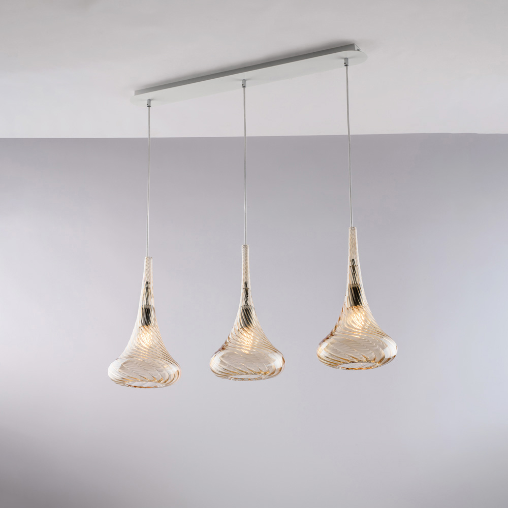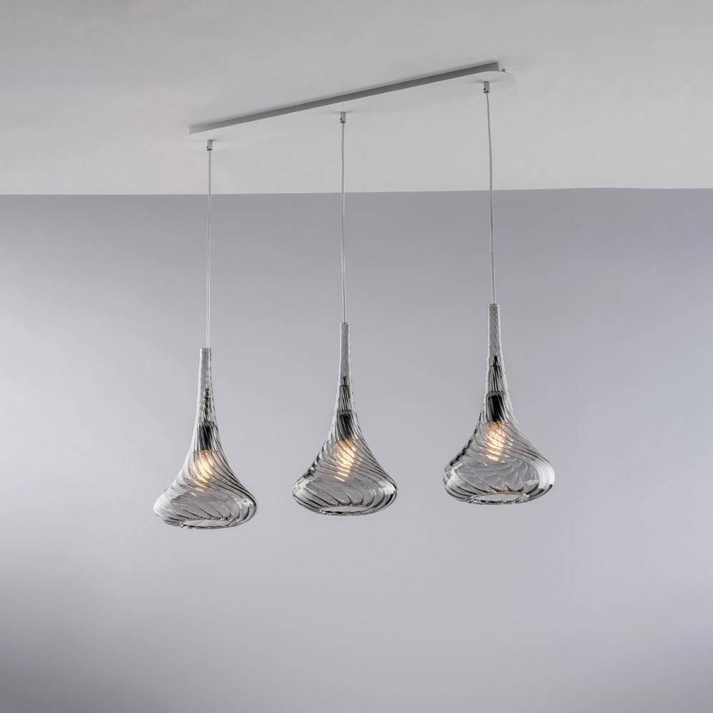 Disponible en acabados transparente , ámbar o gris , esta lámpara colgante te permite personalizar la atmósfera de tu espacio: brillante y minimalista en la versión transparente, cálida y envolvente en ámbar, elegante y moderna en gris. Es perfecta para islas de cocina , mesas de comedor , mostradores , espacios abiertos y entornos de diseño .