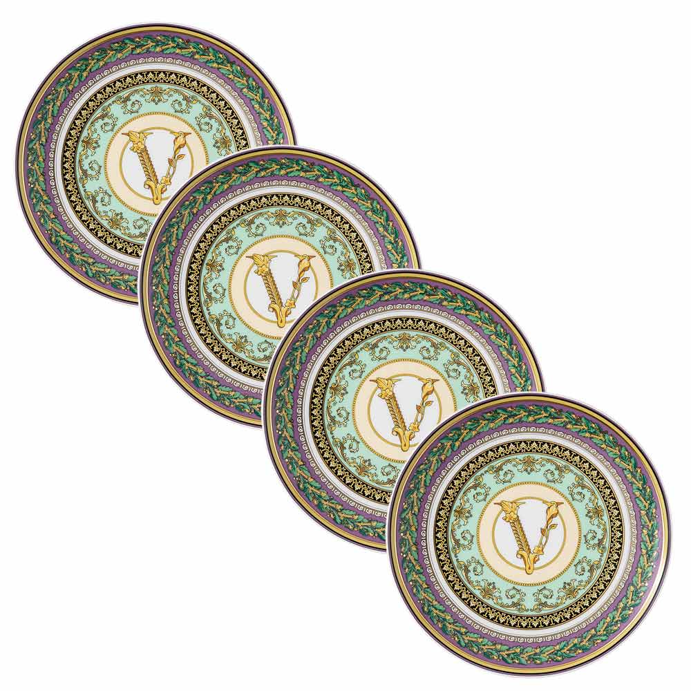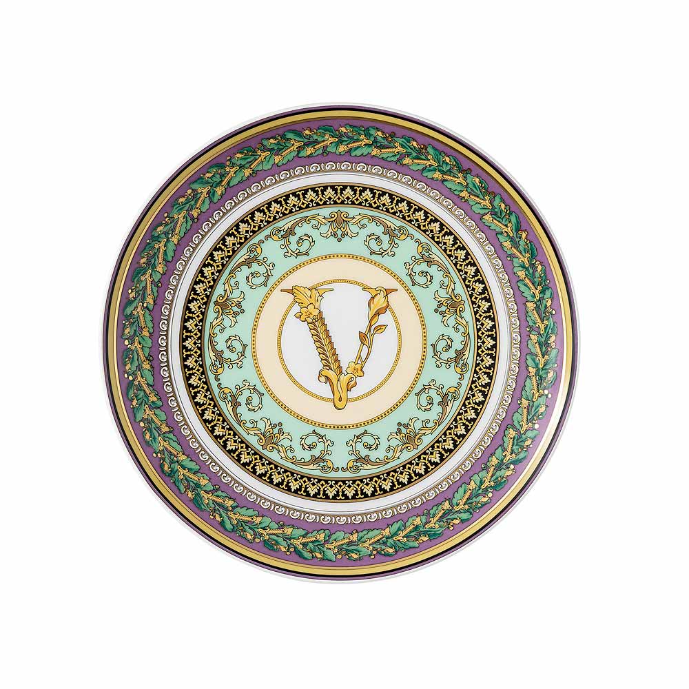 El plato para pan Barocco Mosaic de Versace , en porcelana preciosa , es una combinación de elegancia clásica y diseño contemporáneo. Su diseño único resalta el símbolo "V" de Virtus, rodeado de detalles ornamentales en oro brillante y tonos pastel que crean un efecto sofisticado y cautivador.