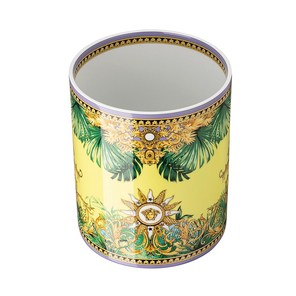 El jarrón Jungle Animalier de Versace , elaborado en porcelana fina , es una obra maestra que combina la elegancia exótica y el lujo atemporal. El impresionante diseño presenta un amarillo vibrante, adornado con motivos tropicales de exuberante follaje y detalles barrocos intrincados, todo enmarcado por el legendario símbolo de Medusa . en el centro, situado bajo un sol brillante y decorado con detalles dorados.