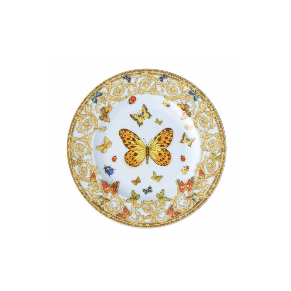 Este encantador plato de porcelana presenta un diseño brillante y colorido que llama la atención de inmediato, lo que lo convierte en un artículo de colección y una vajilla refinada. Una elegante mariposa se destaca en el centro, rodeada por un delicado borde ornamental con motivos florales y arabescos.