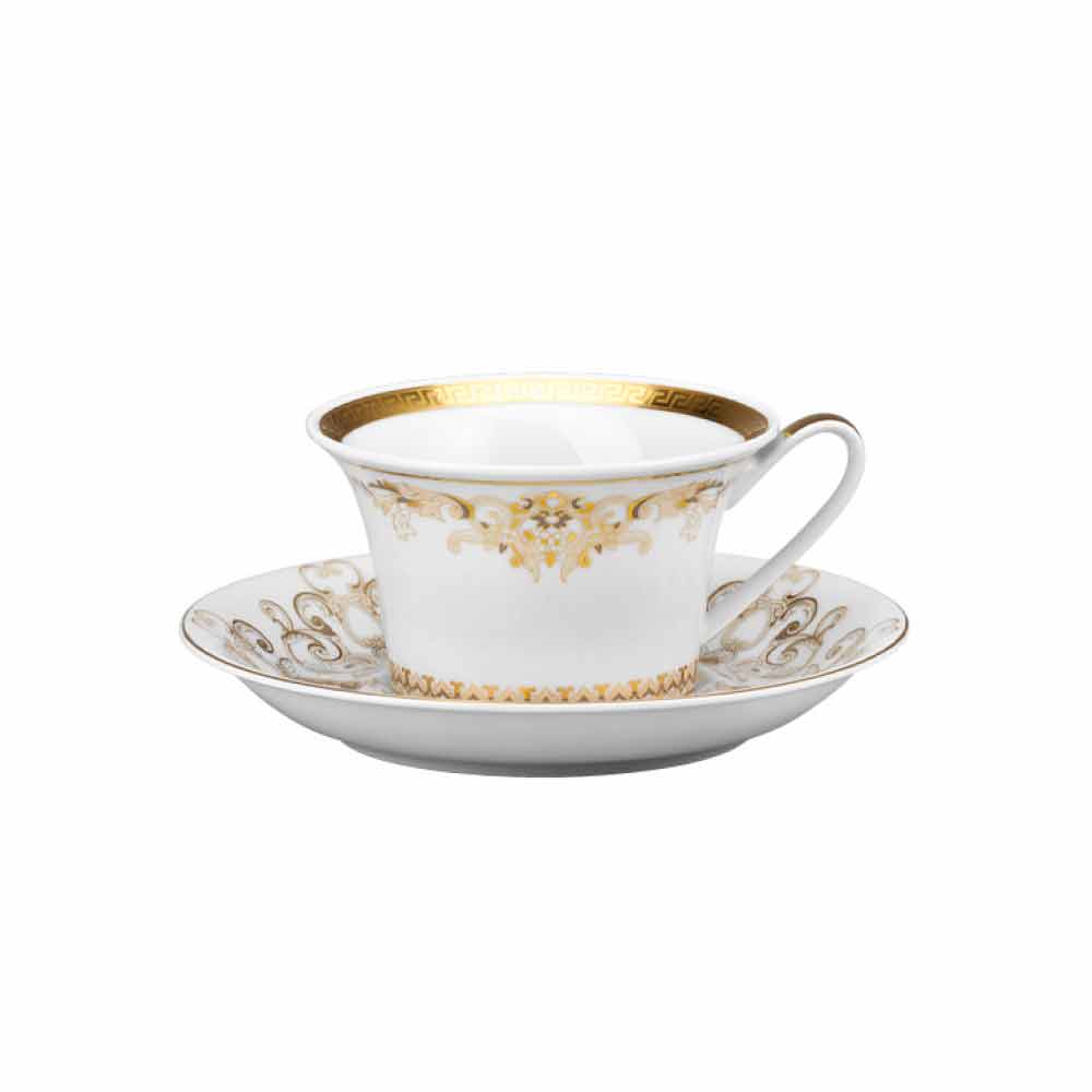 En este juego de 6 tazas de té Todo el refinamiento y el lujo de la nueva colección de vajilla Medusa Gala se encuentran en ella, reinterpretando los motivos tradicionales de Versace en su diseño y decoración: el icono que representa a Medusa se alterna con refinados ornamentos barrocos en una preciosa filigrana de oro. Un emocionante juego de contrastes entre la blancura de la porcelana y el oro puro crea una puesta en escena perfecta, moderna y al mismo tiempo única.