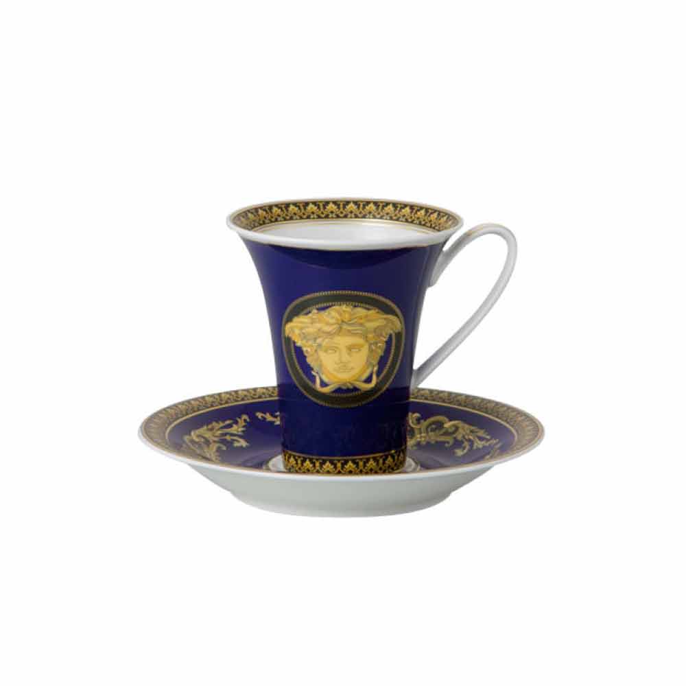 La elegante taza de café alta con platillo de Versace forma parte de la elegante colección moderna que, combinada con un glamour fascinante y refinado, recuerda épocas pasadas y se expresa en el tono brillante del azul y toma el nombre de Medusa Blue.