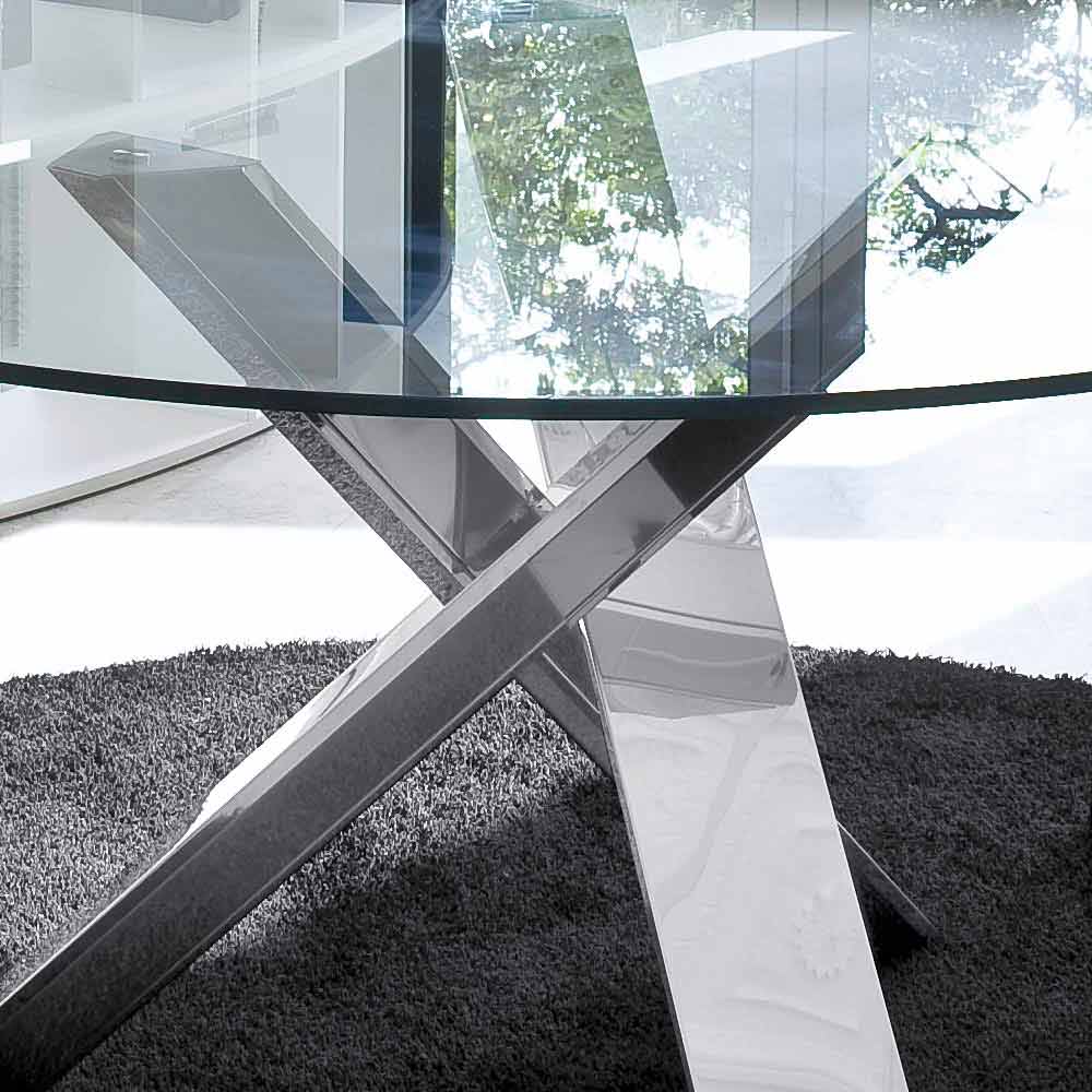 La mesa Cristal con un diámetro de 150 cm cuenta cada momento de la vida cotidiana, agregando elegancia al hogar.