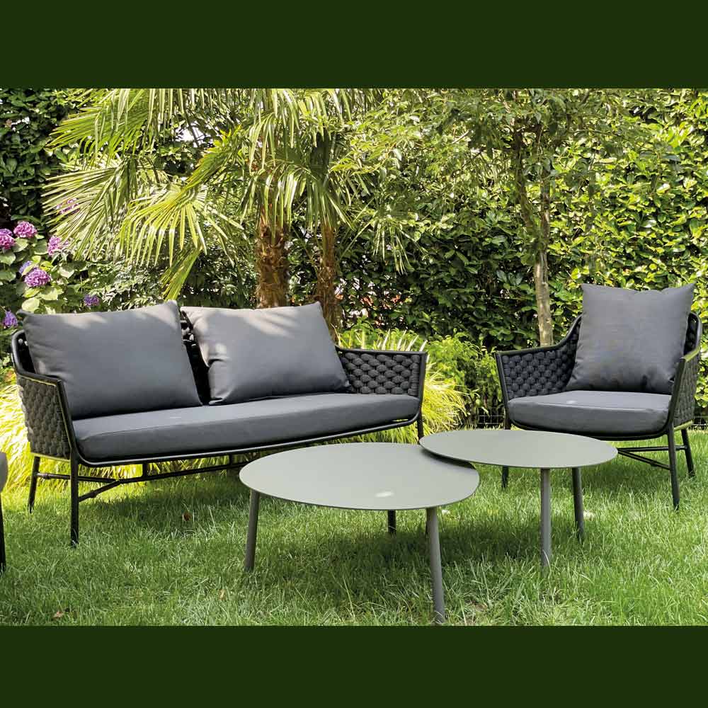 Los lados de cuerda de poliéster tejida con un núcleo de caucho añaden un toque artesanal visualmente impactante, mientras que los cojines de caucho repelentes al agua cubiertos de tela acrílica antracita garantizan una comodidad duradera , resistencia a la intemperie y una agradable sensación al tacto.